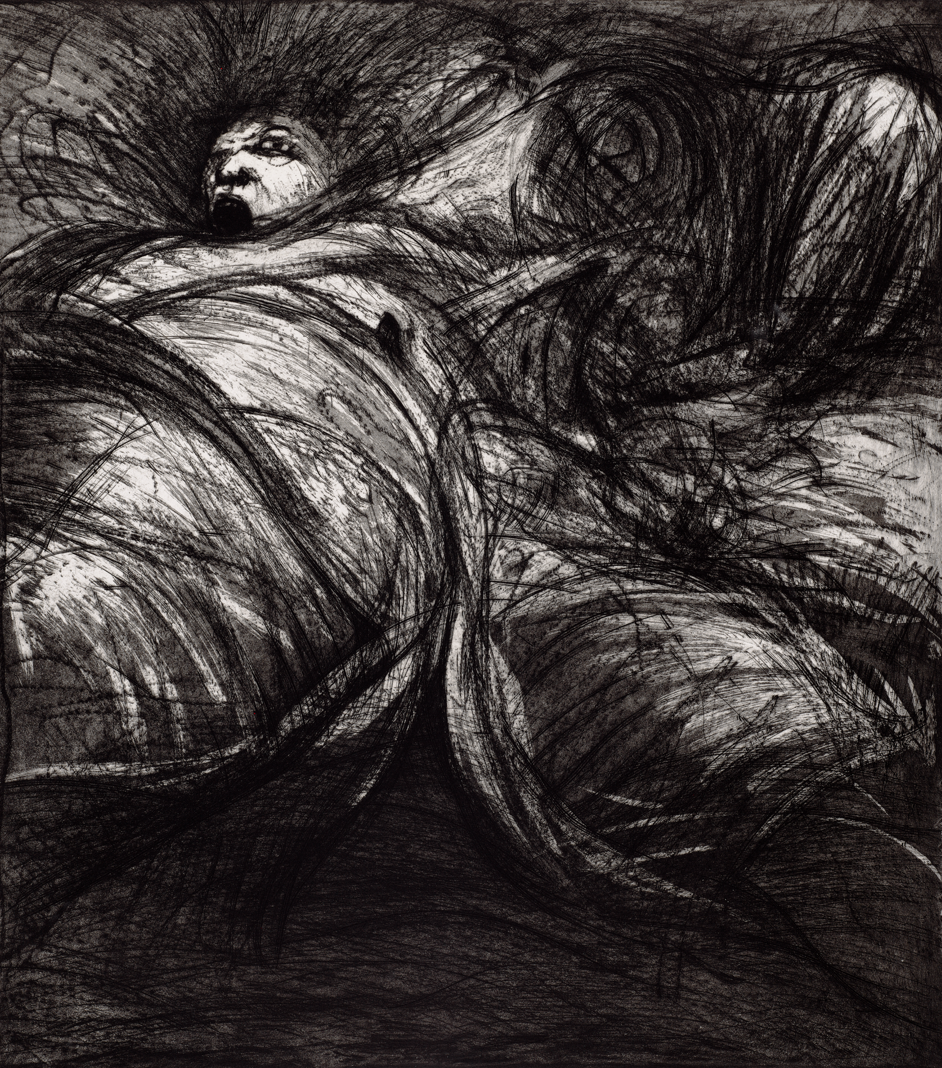 Indeed, the visual tension sustained in these prints of unruly beds comes from the haptic mismatch between the soft pliancy of the objects depicted and the almost violent means and medium of their representation. In the etching of The Occupant, there is a similar attention to technique, making the image inseparable from the processes that subtended it.