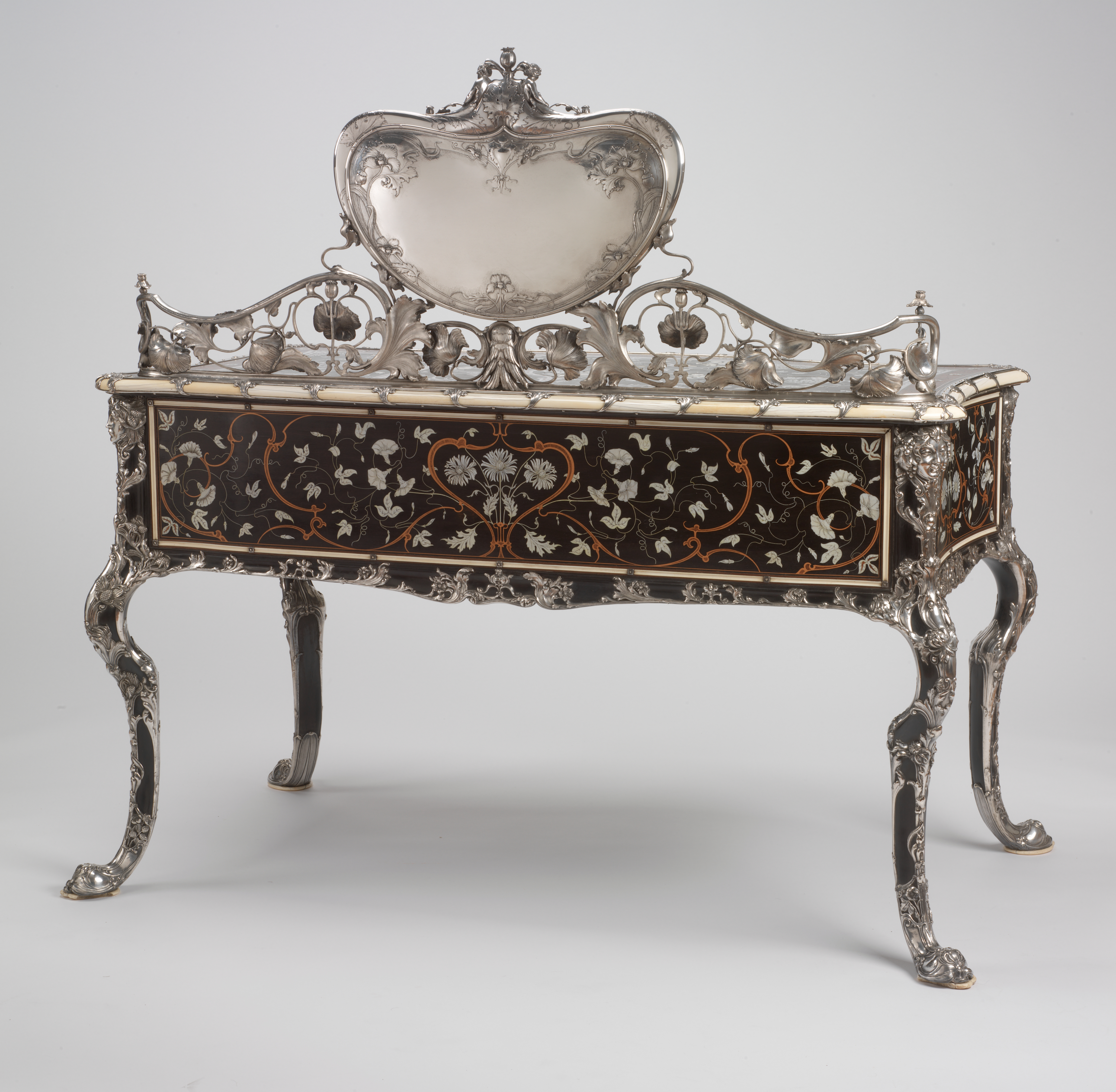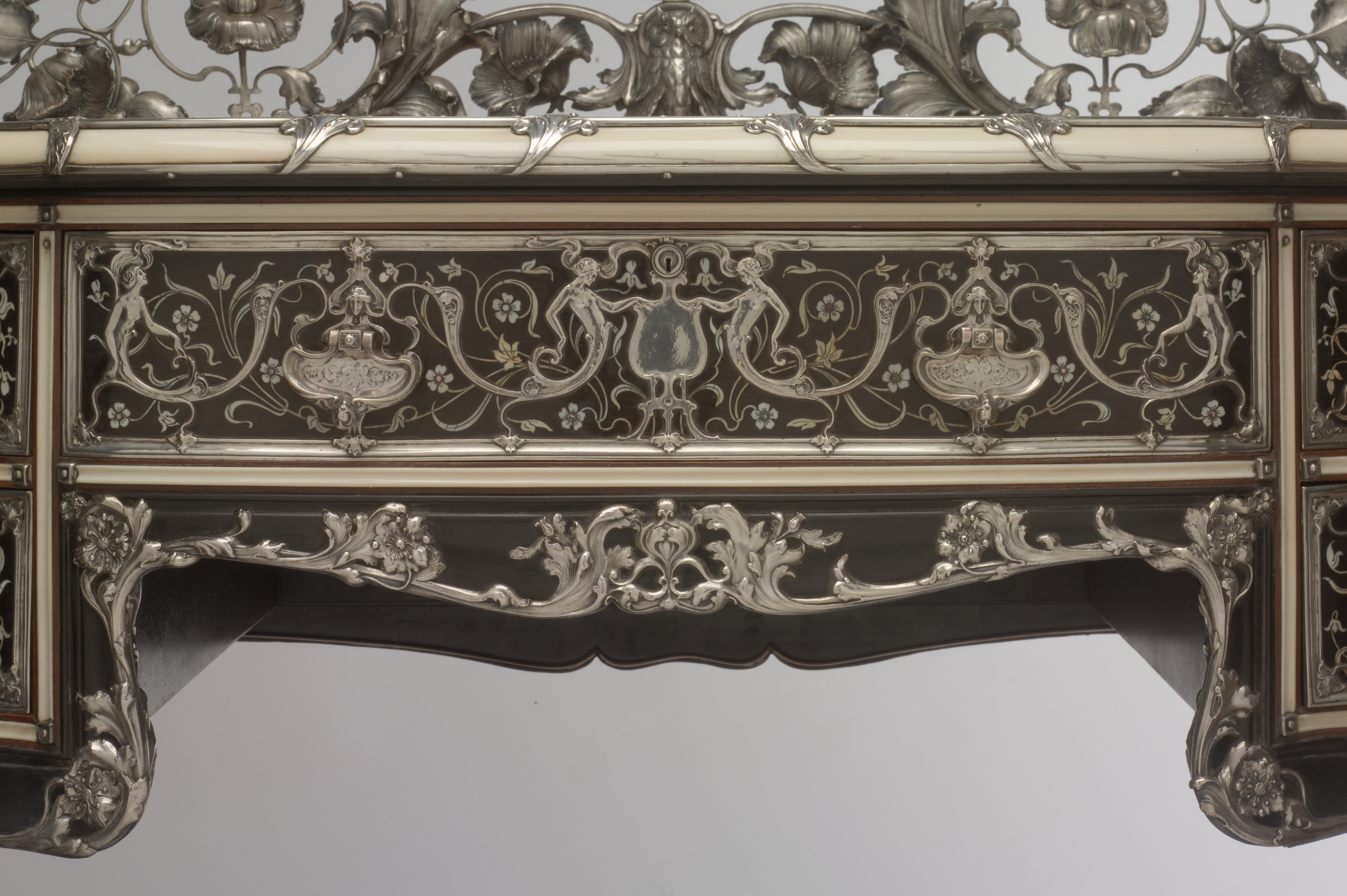 Symbolism cast in silver abounds in the ornamentation of the writing table and chair. The writing table legs rest on small pads of ivory that echo the spoon-shaped feet and are embellished with exquisite Renaissance Revival female masks, each representing one of the four seasons: winter is surrounded by pine cones, spring by lilies, summer by wild roses, and autumn by grapes and chrysanthemums. The silver gallery atop the writing table is formed of intertwined poppies and the mirror is decorated with morning glories, referencing night and day. An owl presides below the mirror, possibly to inspire the sitter to thoughtful writing.