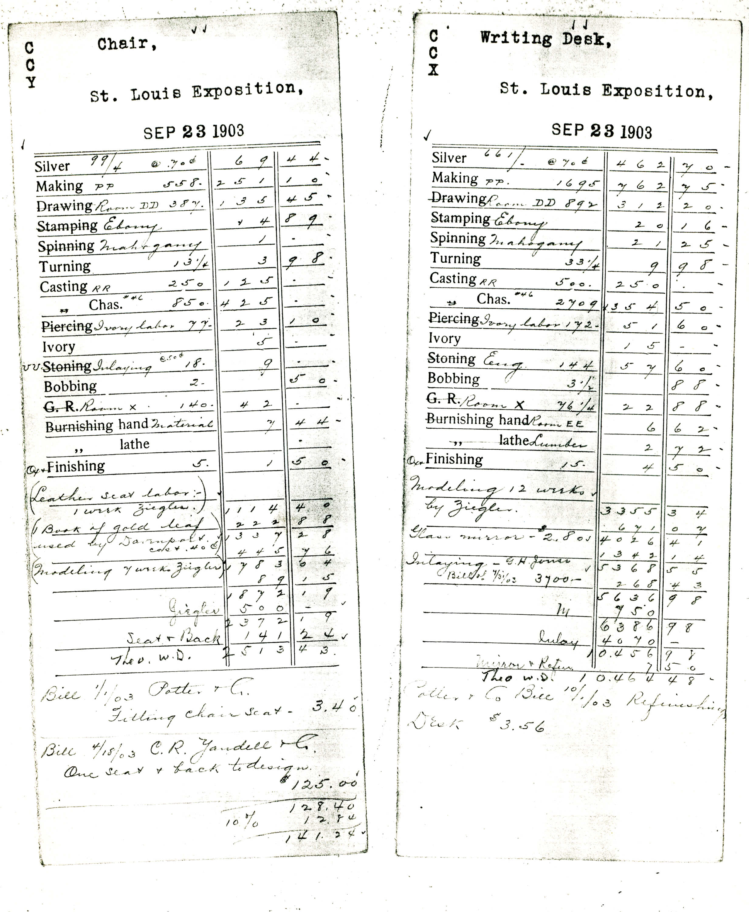 The number of hours accrued and the quantity and cost of each material was documented on costing slips Gorham maintained for their creations. Gorham’s slips for the chair and the desk indicate that approximately 50 pounds of silver was used.