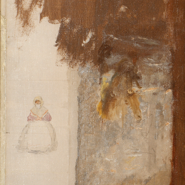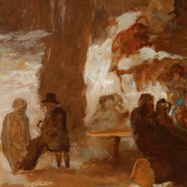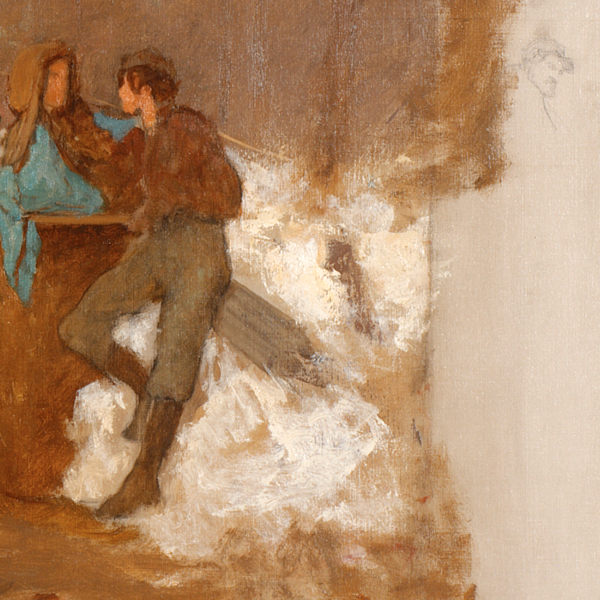 Johnson illustrates Couture’s lessons in Sugaring Off by blocking in his background with a broad brown wash, then bringing his figures forward with strokes of brilliant color that provide enough detail to distinguish their characters. At this stage, the painting offers the sensation of the dress rehearsal of a great American opera whose cast has assembled in anticipation of a precisely choreographed performance. A loosely painted wooded setting creates the backdrop, while in the exposed margins of the canvas Johnson’s little oil sketches and pencil drawings suggest understudies in alternate poses. The result is a rare glimpse at Johnson’s creative process, informed by a new way of constructing a painting that would have been invisible to the viewer once Johnson applied the final stages of finish.
