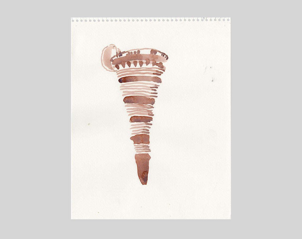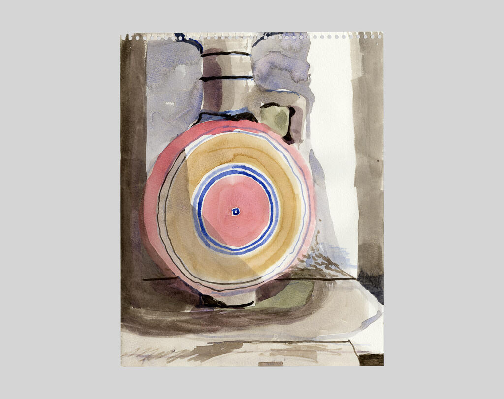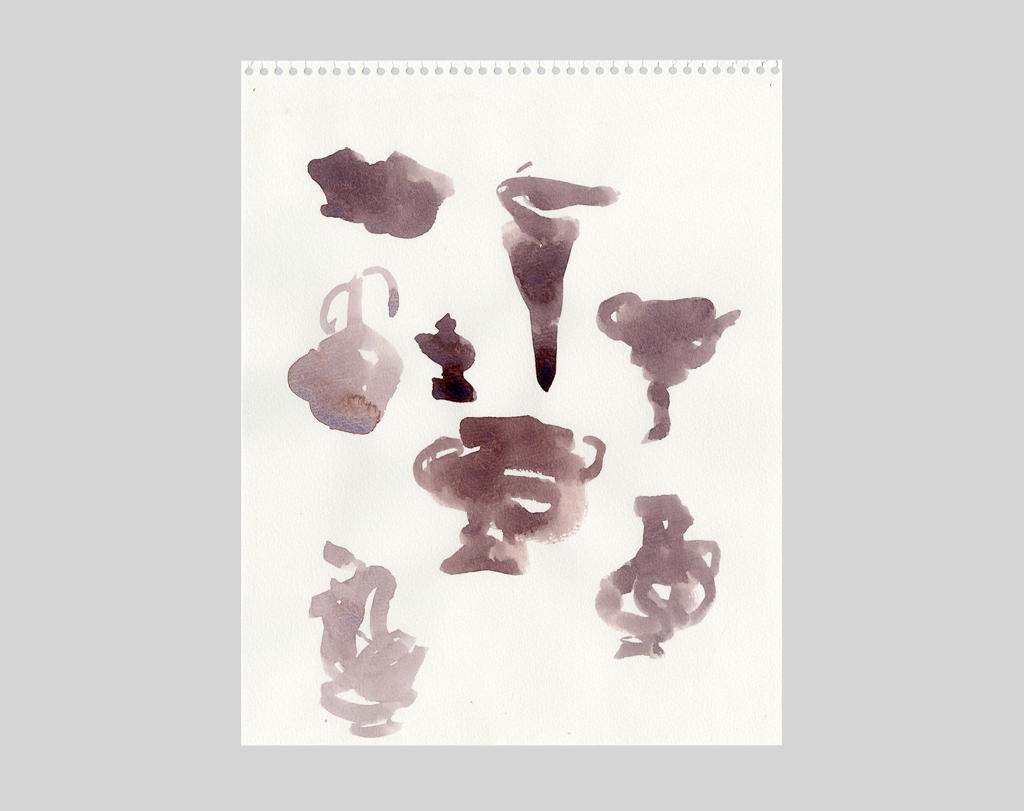 I was settled on the exhibit, and returned to paint the pots for three hours in watercolors. The first works were more straightforward studies, like a formal introduction to each object, the pots painted as they sat amongst one another. Once I became more comfortable, I began exploring them individually and focused on distilling their formal elements, such as symmetry, negative space, and the way the lines describe their forms. All of these qualities allowed different avenues for describing form and space in single gestures. I really like how the marks have guttural tension; they function as a movement within a whole framework, rather than alluding to something beyond itself.