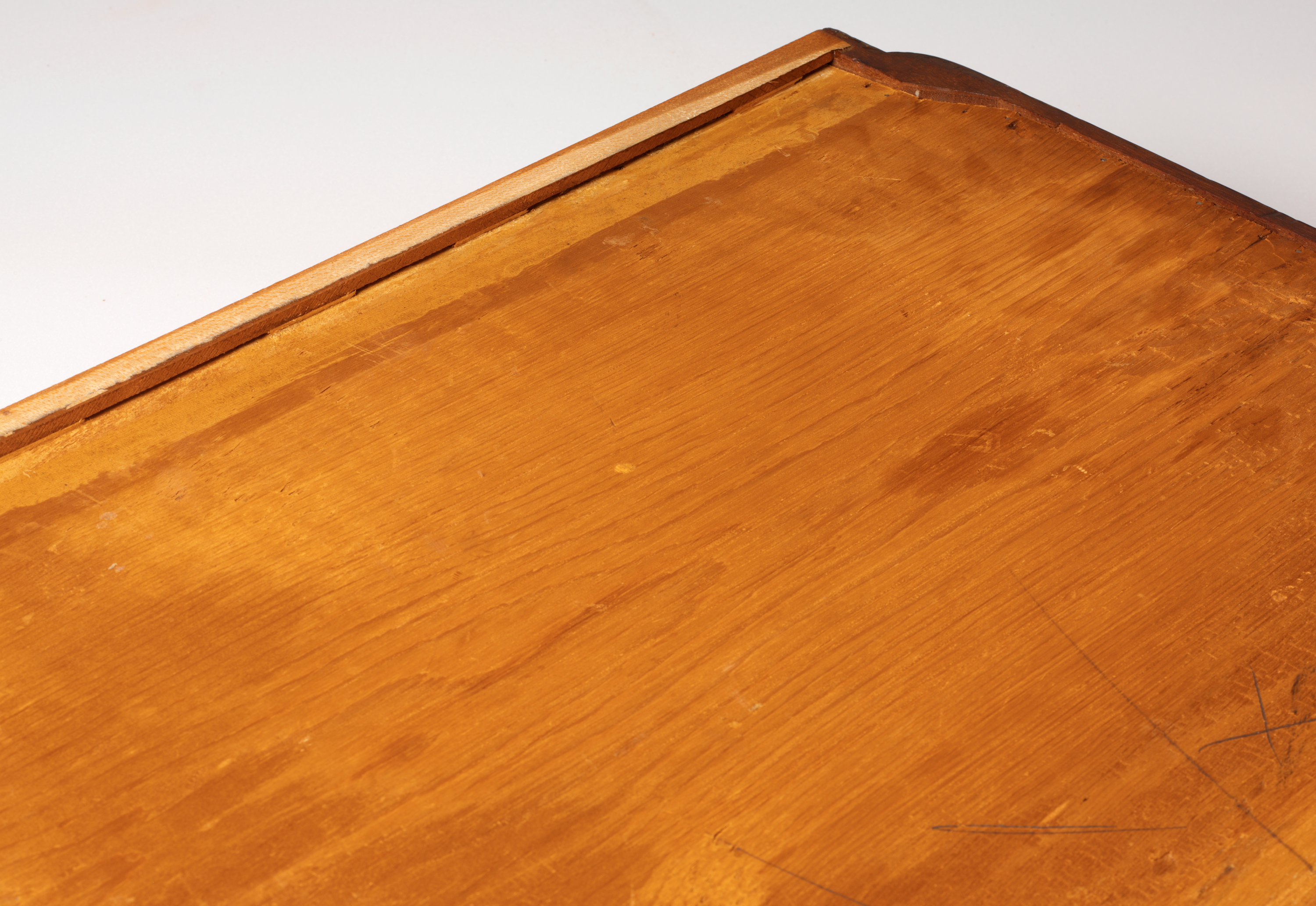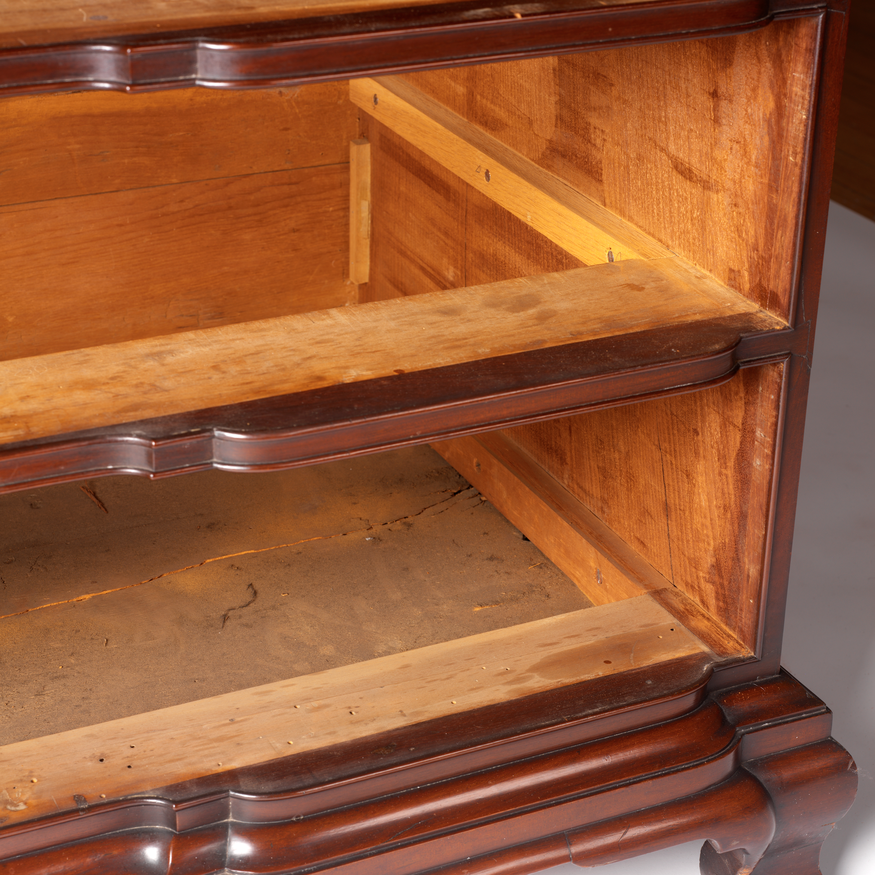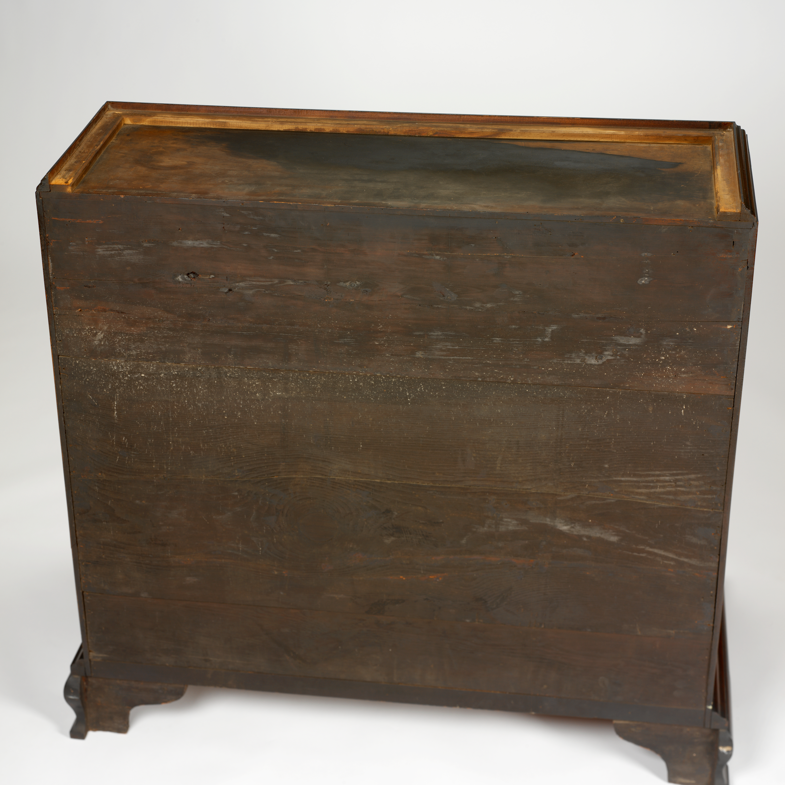 The researchers meticulously examined the entirety of its mahogany surface, from the decorative carved shells to the delicate brass hardware. They opened the doors of the bookcase, revealing variously sized compartments, shelves, and movable dividers. They scrutinized each individual drawer, noting its construction and the type of wood from which it had been made. Occasionally they would discover a graphite number on the interior of a drawer, scribbled by a cabinetmaker to indicate its place within the desk. They even examined the back and the base of the piece, both of which were made from rougher, plainer boards.