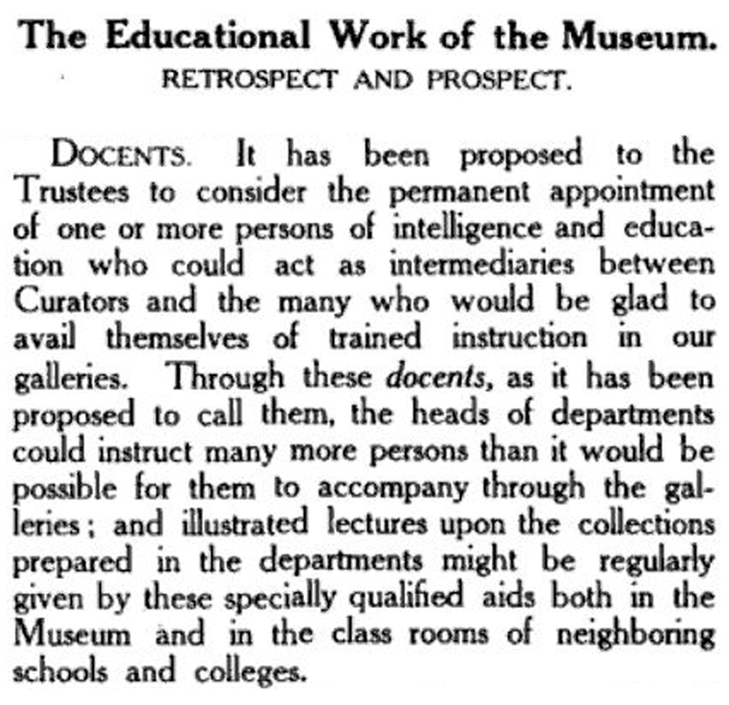 This excerpt from the 1906 Museum of Fine Arts Bulletin includes the first use of the word “docent” in a museum publication