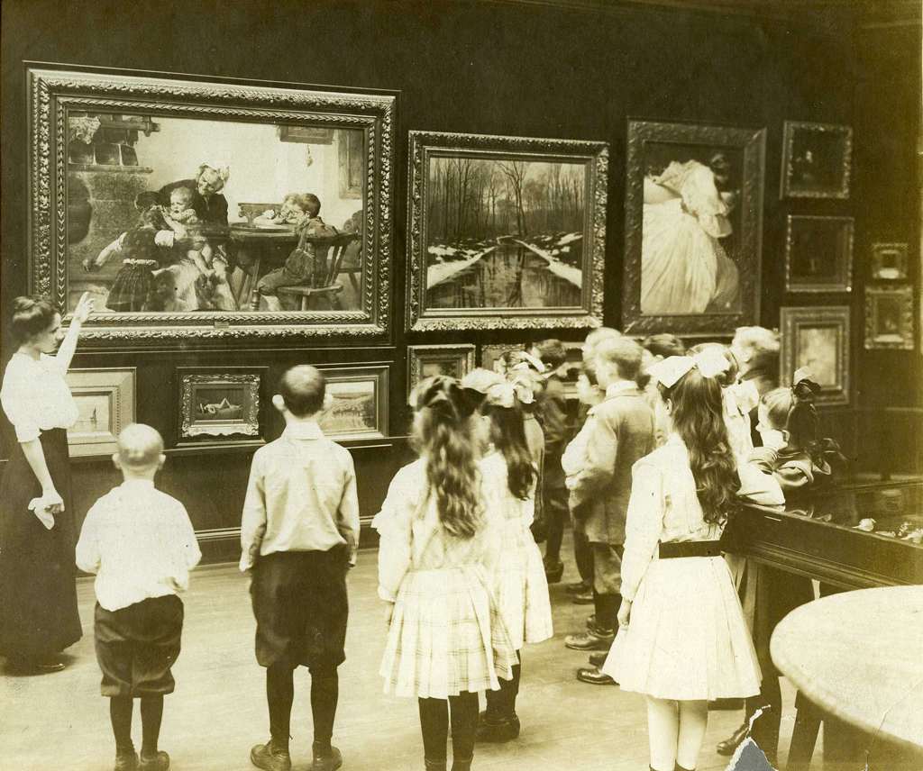 Although the Museum was indispensable to the education of RISD students from its earliest days, its efforts in educating the public were less commendable, and it was far from unique in this regard. It was not until the early 20th century that museum professionals began serious discussions about their responsibility toward the education of the general public. Public programs were infrequent and almost exclusively restricted to curatorial lectures. One of the earliest and most frequently cited public commitments to education was in the June 1906 Bulletin of the MFA Boston, in which that museum coined the term “docent.”