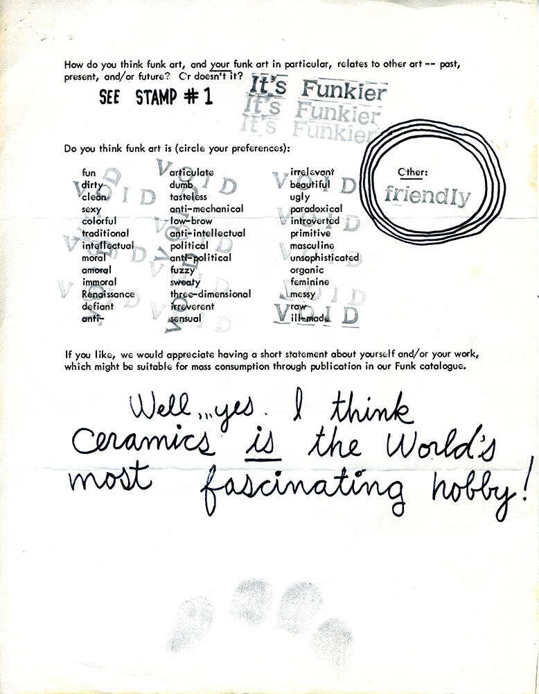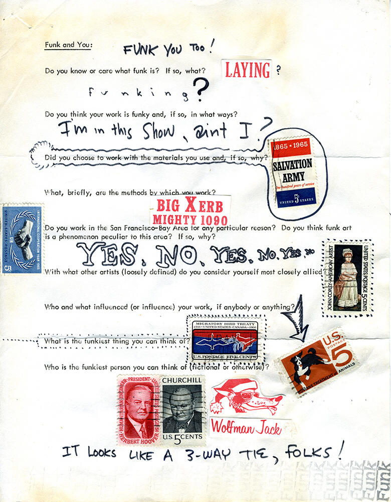 Arneson answered many of the questions by pasting U.S. postage stamps in the margins or by writing derisive and evasive answers such as a string of the words Yes, No, Yes, No in large capitalized bubble letters. At the top of the survey, Selz included the heading “Funk and You,” to which Arneson responded “Funk You Too!,” alluding to Funk as an action perhaps not dissimilar to the expletive in which the n is replaced with a c. Arenson’s answers, in their bombast and confrontational manner, seem to encourage Selz, further reinforcing and perhaps foregrounding the definition of Funk art he would issue in the 1967 exhibition catalogue: “Funk art is hot rather than cool; it is committed rather than disengaged; it is bizarre rather than formal; it is sensuous; and frequently it is quite ugly and ungainly.” 5 When examined closely, surveys by Arneson and the other Funk artists support (more than they object to) Selz’s classification of their work as Funk art. The surveys as primary source documents provide a glimpse into not only the research phases of exhibition making, but in some small way shed light on the very formulation of an art-historical classification as it was being constructed through artist-to-curator and curator-to-artist communication.