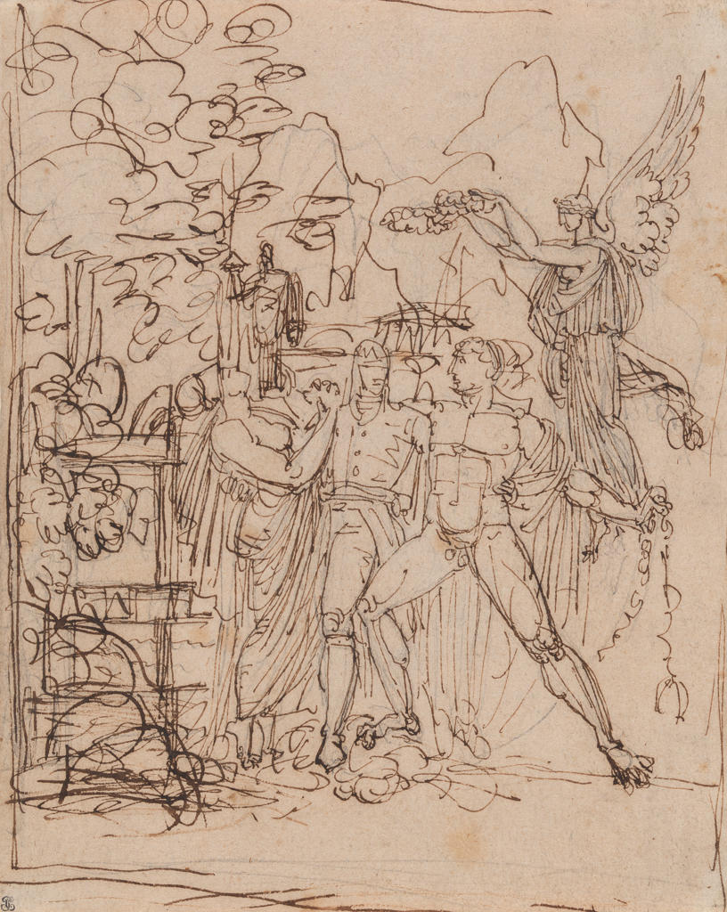 In our drawing, Napoleon is depicted as a heroic liberator, flanked by a female figure in a helmet suggestive of Minerva, the Roman goddess of wisdom; the figure represents Italy. To Napoleon’s other side, a muscular Herculean nude, probably a representation of the French people, has broken through chains of oppression and holds out a small statue, a gesture from the French to their new allies. This statuette, a vision of justice and equality, grasps a level and a shield. Both the style and content of this depiction serve to place Napoleon symbolically within the context of the Roman Empire’s classical past. In fact, Virgil’s tomb can even be spotted in the background. The soon-to-be emperor later reflected on this victory, recalling that in Italy “I realized I was a superior being and conceived the ambition of performing great things, which hitherto had filled my thoughts only as a fantastic dream.”