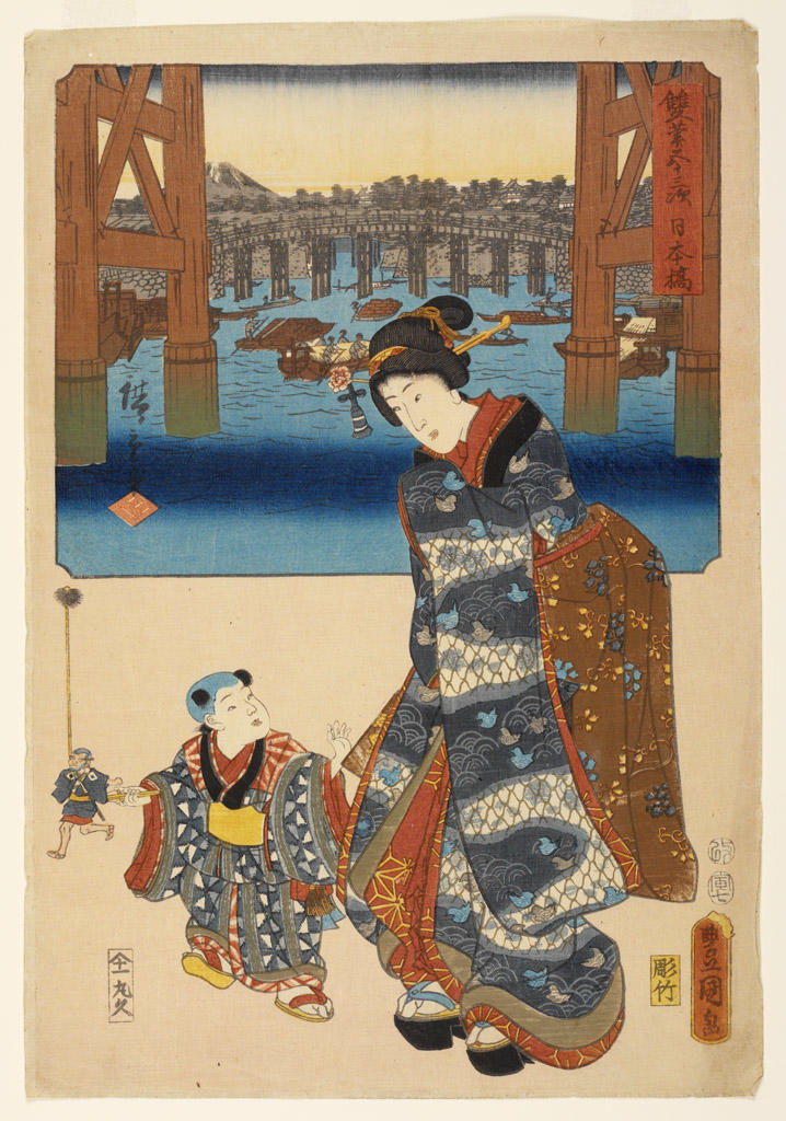 Ill. 7 Utagawa Hiroshige, 1797–1858 (landscape inset) Utagawa Kunisada I (Toyokuni III), 1786–1864 (figures) Nihonbashi, the sta