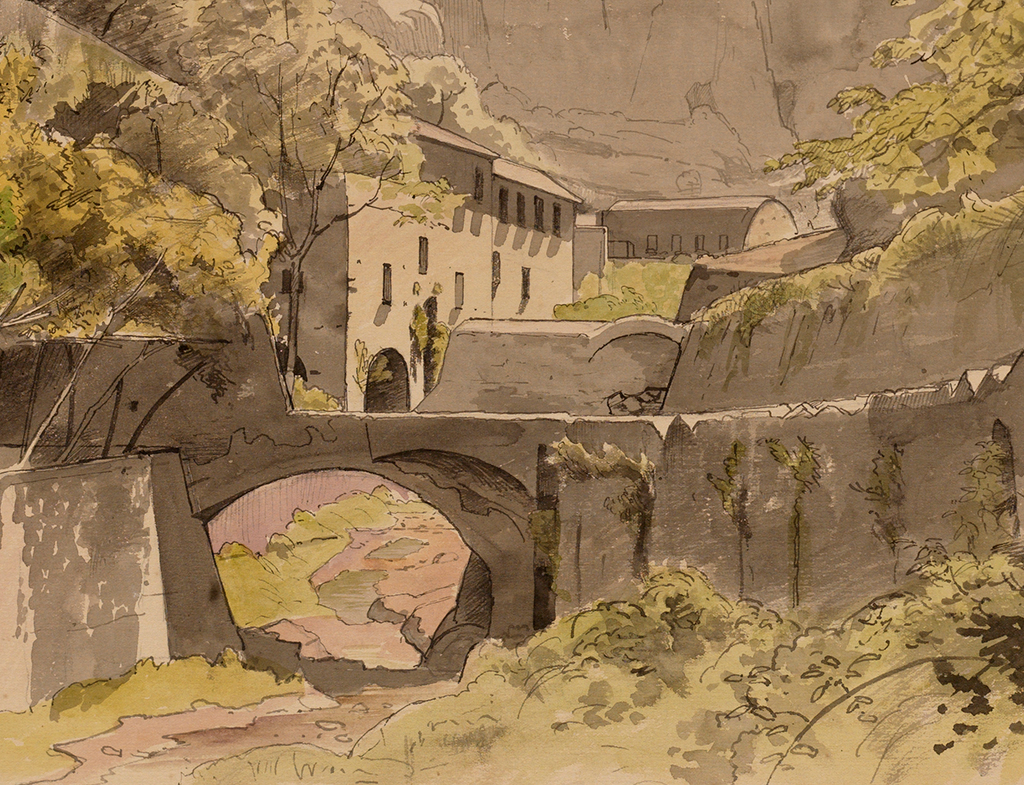 To capture this view, Haseltine followed the footpath up the flank of the valley past the cascades that fed the mills, stopping at a spot where the ravine narrows and a rivulet is crossed by a stone bridge. At middle distance he recorded a stucco building, illuminated by sunlight, and the rounded roof of barn. Small, flat-roofed structures can be seen above the foliage at left and below a craggy peak. These elements of vernacular architecture suit Haseltine’s conception of seemly, non-invasive industry, while the atmospheric prominence of the high ridge in the distance heightens the drama of the composition. Unlike Bierstadt, who included figures in his rendering of a picturesque cooperage along the Rhine (see Landscape on the Rhine), Haseltine refrains from introducing signs of the local peasantry.