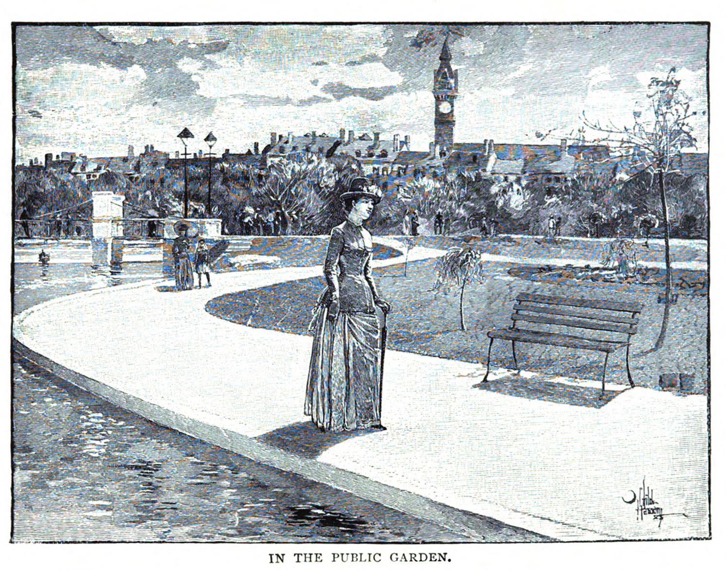 The strolling female figure was an important trope for painters of modern life, both in Paris and in Boston, and appealed to collectors. By the late 1870s, this subject was already a particular preference of American collectors of paintings by Giuseppe De Nittis, Jean Beraud, Giovanni Boldini, and Jean-Francois Raffaelli. Hassam shared that interest and emphasized the respectability of his city’s parks. In 1885 he made a series of illustrations for A New Departure for Girls, a book by the popular author Margaret Sidney.Margaret Sidney (Mrs. Harriet Mulford Stone Lothrop), A New Departure for Girls (Boston: D. Lothrop and Co., 1886). In this inspirational novel, the protagonist sets out to seek work and finds herself on a path that curves around the lagoon in the Public Garden. (Fig. 1) “A Garden in the city’s midst!” she exclaims, describing it as a place more energizing than rural nature—still and peaceful but “responding to healthy longings for activity.”Sidney, 1886, 47–48. As in RISD’s watercolor, this view shows the garden’s suspension bridge in the background, but the stroller’s excursion takes place on the opposite side of the lagoon, with the clock tower of the old Providence-Boston train station prominent against the sky. A skilled “black-and-white man,” Hassam most likely made this version as a monochromatic painting that in turn would have been cut onto a wooden block by professional line engravers. Illustrators who provided pen-and-ink drawings and monochromatic paintings to publishers were called “black-and-white men.” Their images were then cut into hardwood printing blocks by expert line men who often added their names to the artist’s signature. John Schoelch and George L. Cowee engraved the blocks for A New Departure for Girls.