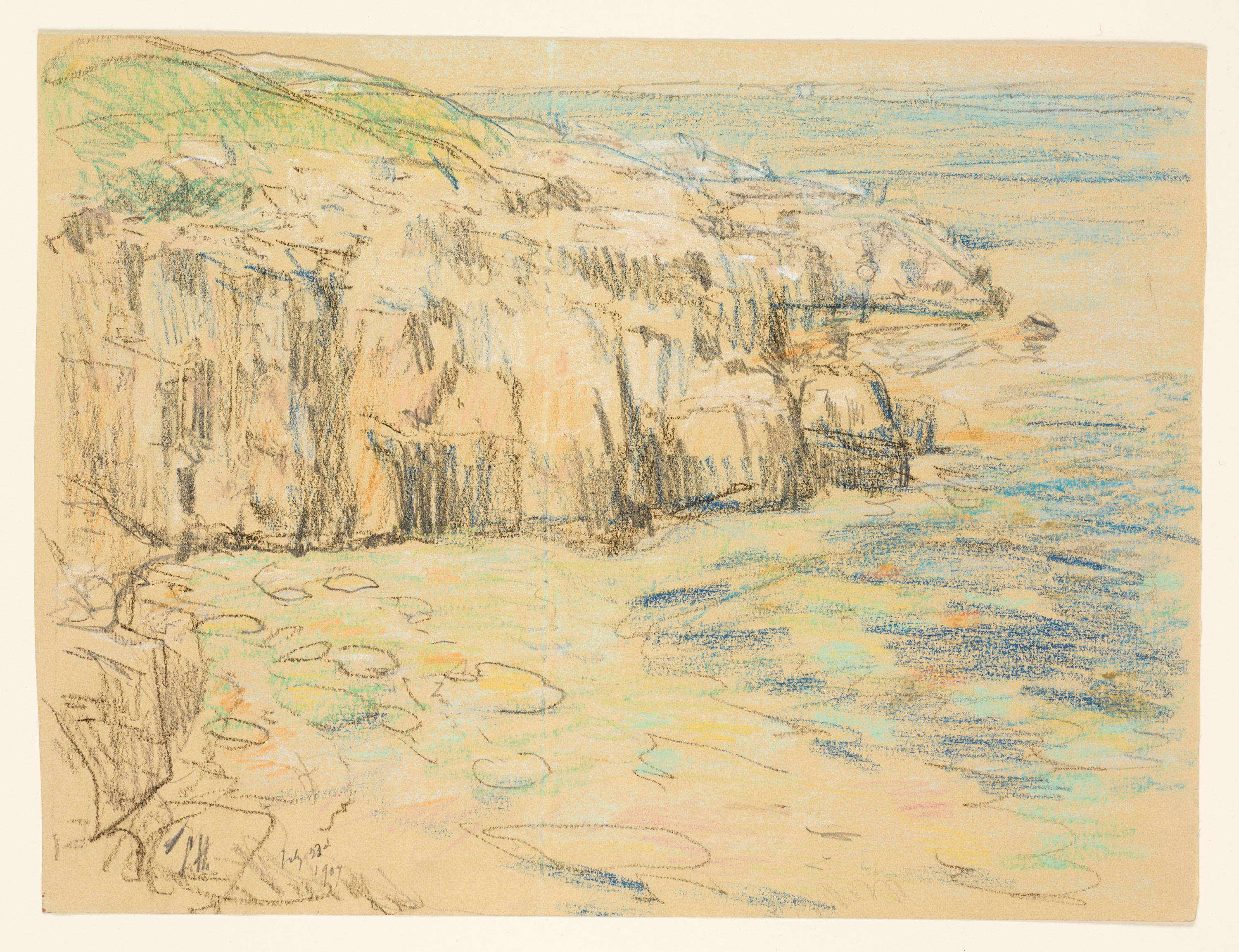 In graphite and black chalk, Hassam mapped out the drawing’s composition, devising a reverse S-curve to lead the eye from the transparent waters of the cove to the rugged contours of the cliffs. He sketched the cliff walls and recesses with a close up-and-down stroke, connecting them with a line that concludes in an anchoring scribble at lower left. The rocky mass ascends to the top of the sheet where it is intersected by a sliver of the mainland, just visible on horizon. Allowing the buff color of the paper to suggest the earthy tints of the rocks, Hassam applied a palette of blues and yellow-greens to represent the lively movement of light on the water and the growth of algae on the cliffs. He used white chalk to heighten the reflected brilliance of their rocky surfaces and to pick out stones in the shallow water near the shore. A comparison of Diamond Cove, Appledore, with the related oil painting of this site reveals Hassam’s full grasp of his subject in its preliminary stages. The drawing contains the complete armature for the larger composition, from the slender ribbon of sky to the foreground’s rocky perch. On Appledore Hassam drew from life, recreating—even in a quick sketch—the visual experiences that were among the richest and most meaningful of his career.