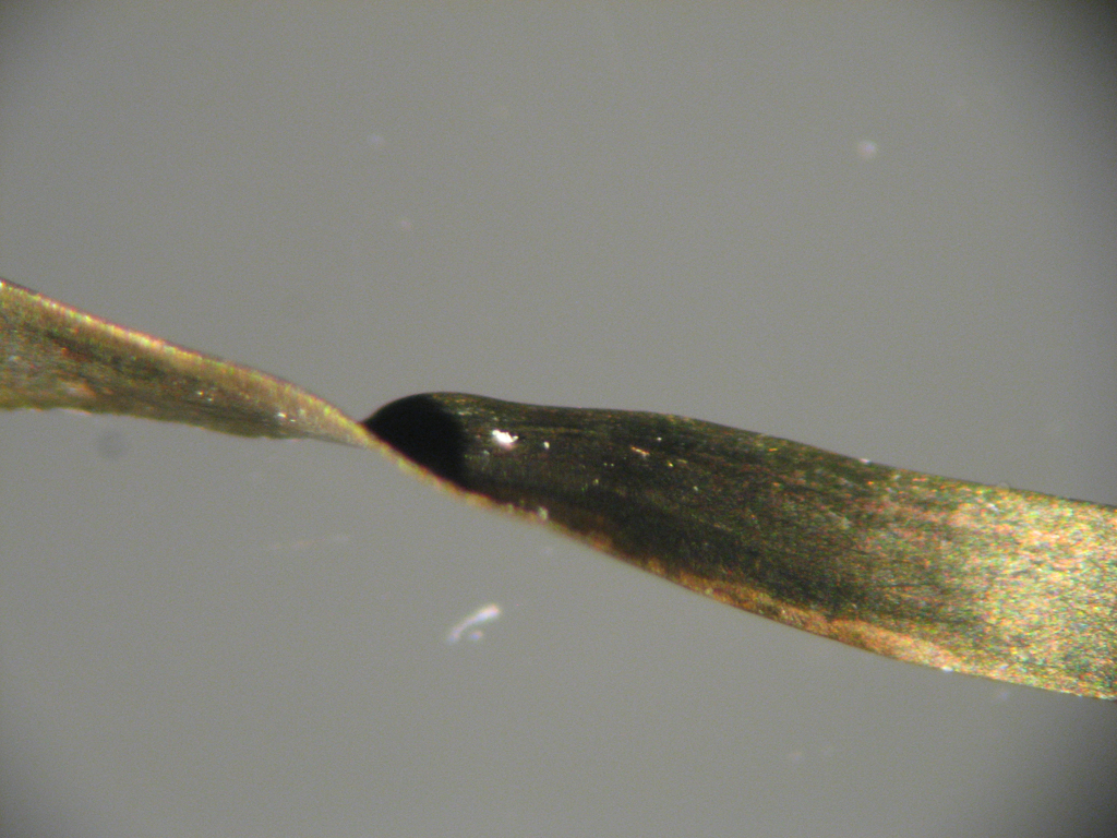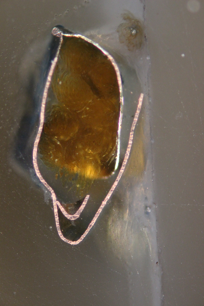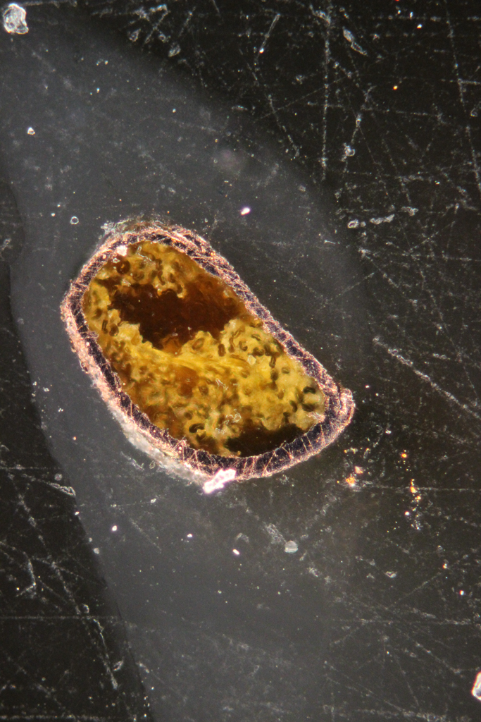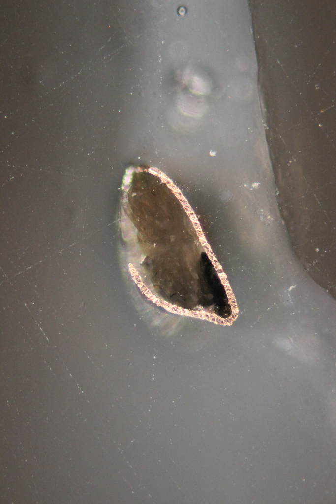 To discover more about Edith’s metallic yarns, I first examined them with a stereomicroscope, which revealed an exciting assortment of structures. Some are comprised of simple metal strips, while others feature the tell-tale “barber pole” appearance of metal wrapped around a twisted fiber core. Next, cross-section samples were prepared by slicing off tiny portions of loose yarns and mounting them in resin. These samples revealed additional variation in how each yarn was made.