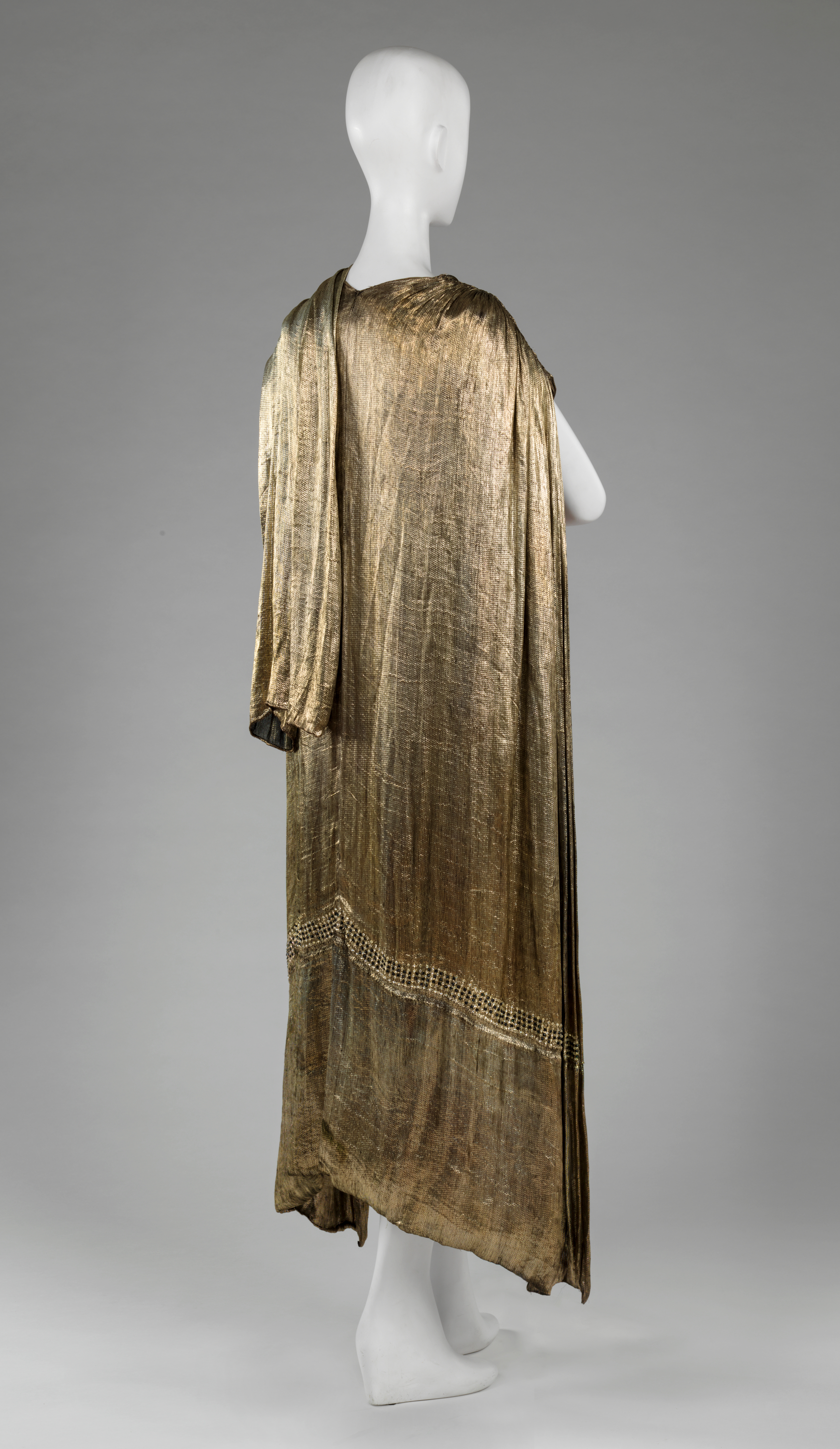 Two-piece dress, Mariano Fortuny y Madrazo, ca. 1926; magnified metallic yarn, with yellow-dyed fibers inside to complement the golden tone of the metal.