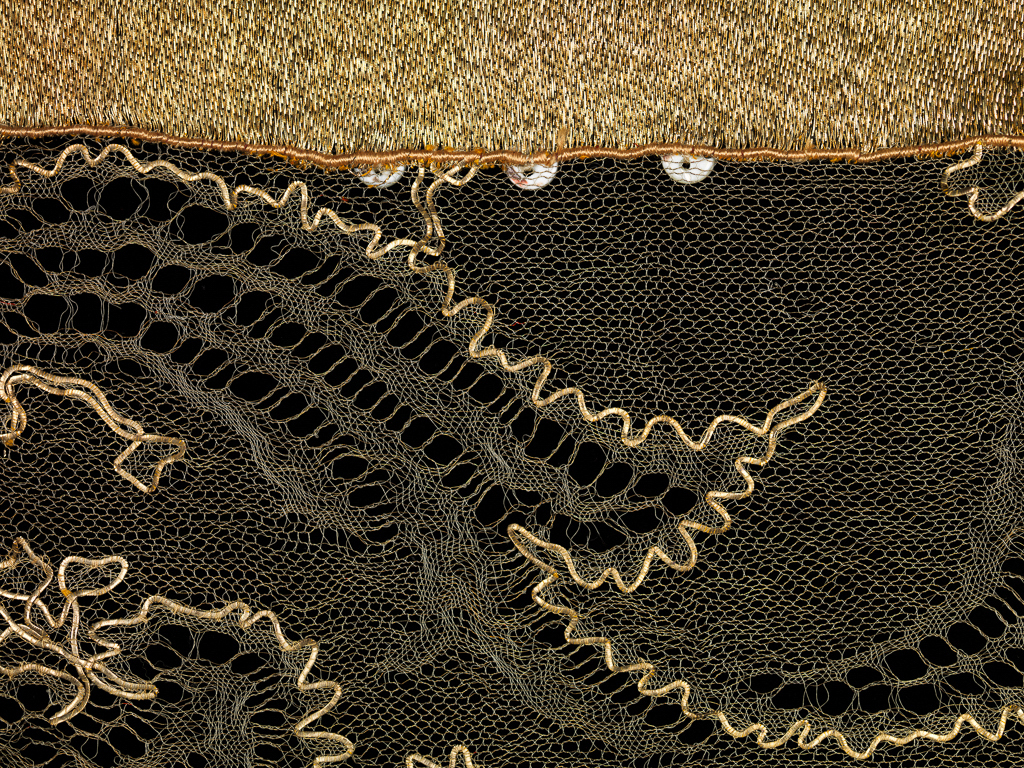Metallic yarns and threads have played a significant role in luxury textiles throughout history and across many cultures. During the 19th and 20th centuries, developments in metallurgy and textile science allowed for use of alloys, electroplating, and laminates that mirrored the appearance of silver and gold at a lower cost. The value of metallic yarns, however, lies not exclusively in the materials but in the time and care required to spin fibers and prepare thin strips of metal. Labor and cost are compounded by the quantity of metallic yarns required for a single textile. For example, Edith’s cape by the House of Worth, pictured below, contains more than four miles of glittering weft.