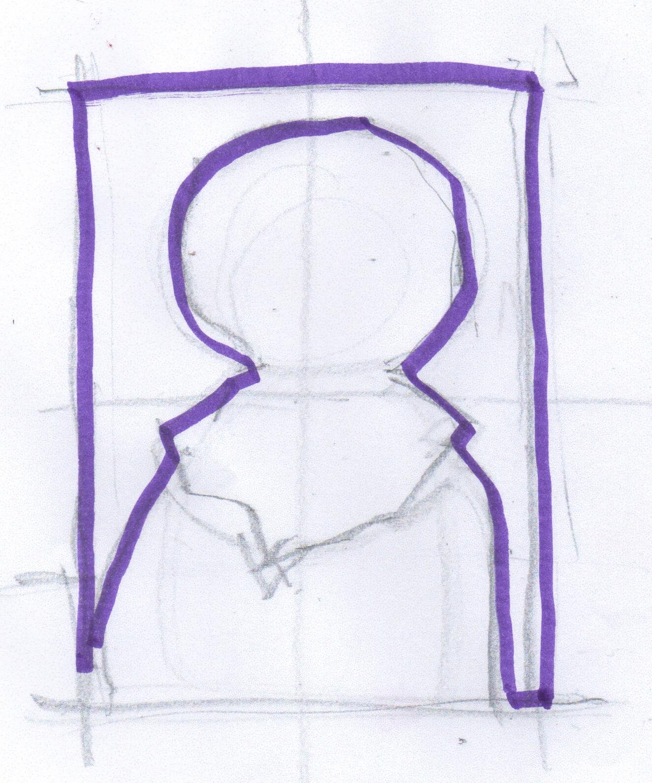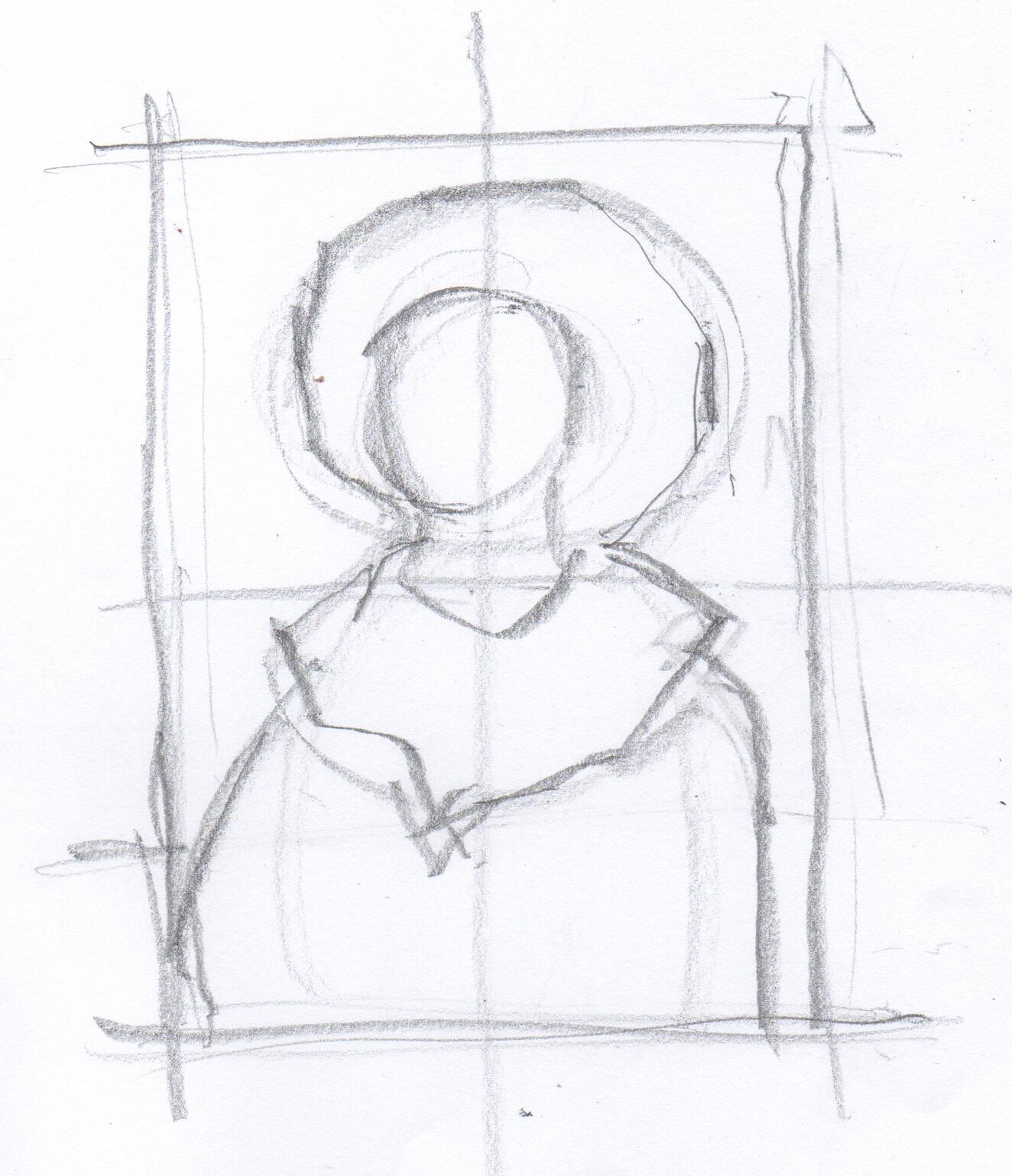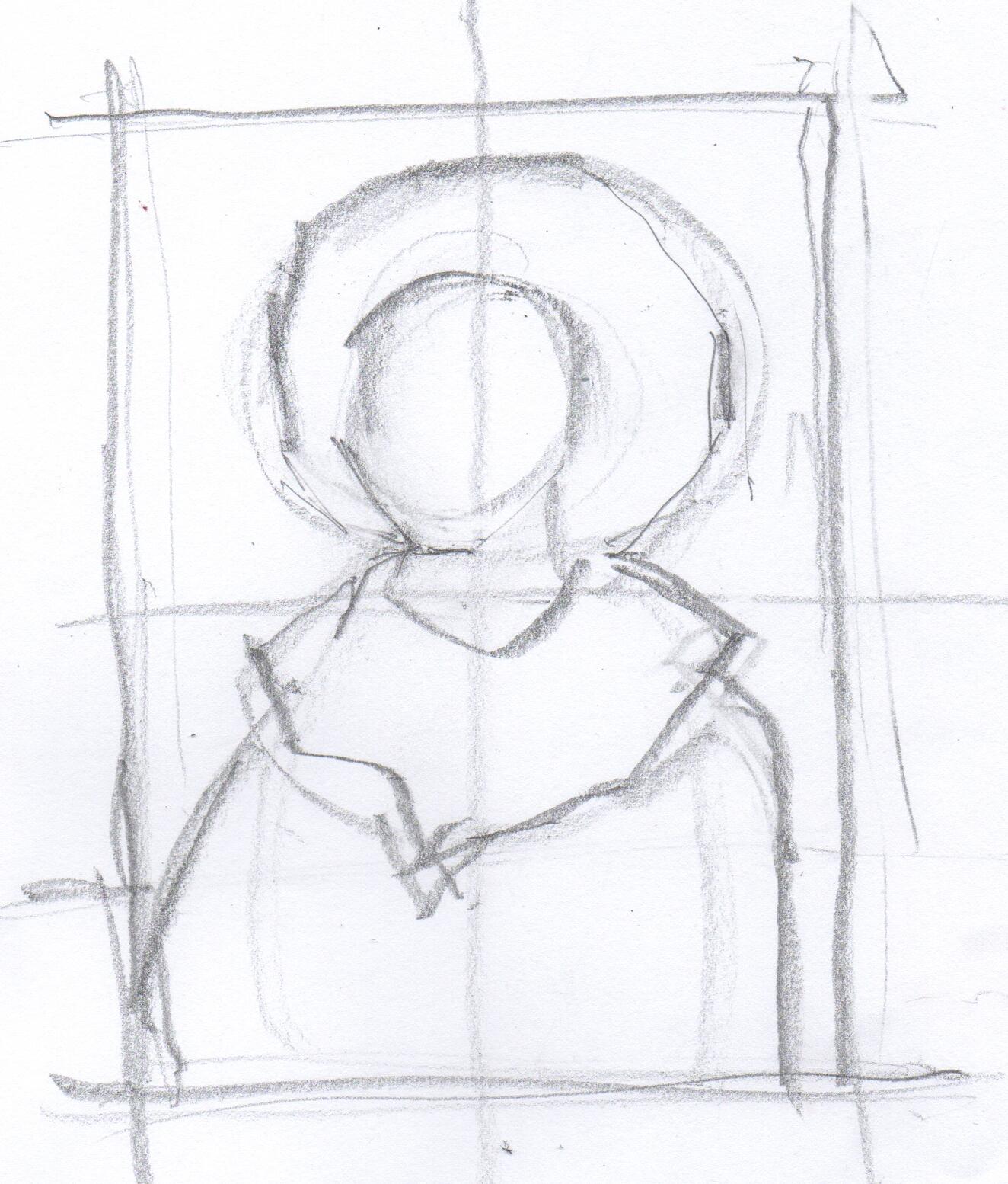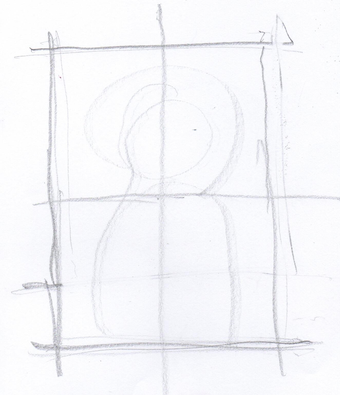When I squint at this picture, what strikes my eye is the overall light/dark pattern and the overall proportion of the pictures. I want to establish these proportions on my page, as an underlying armature, before I add details.