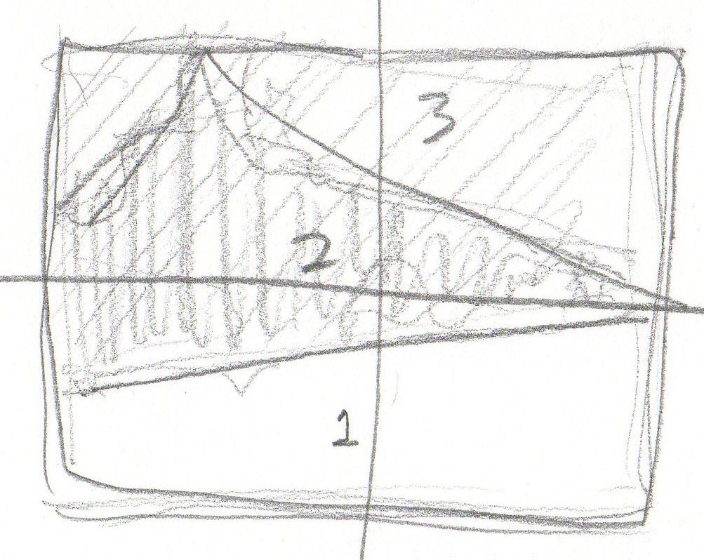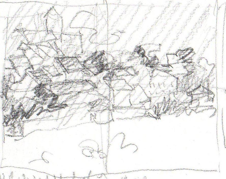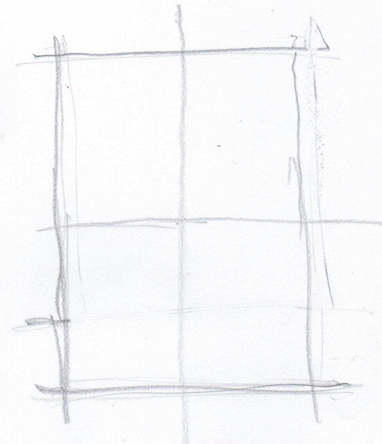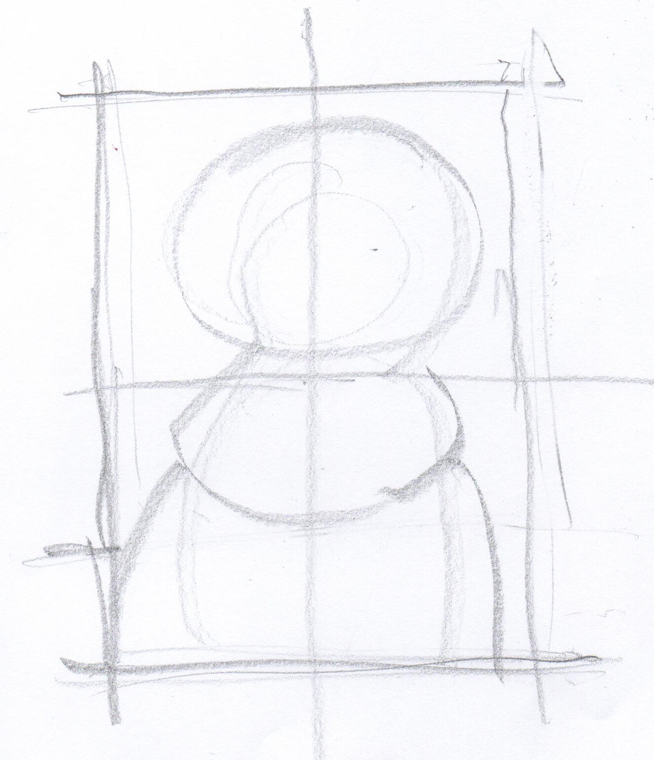 When I squint at this picture, what strikes my eye is the overall light/dark pattern and the overall proportion of the pictures. I want to establish these proportions on my page, as an underlying armature, before I add details.