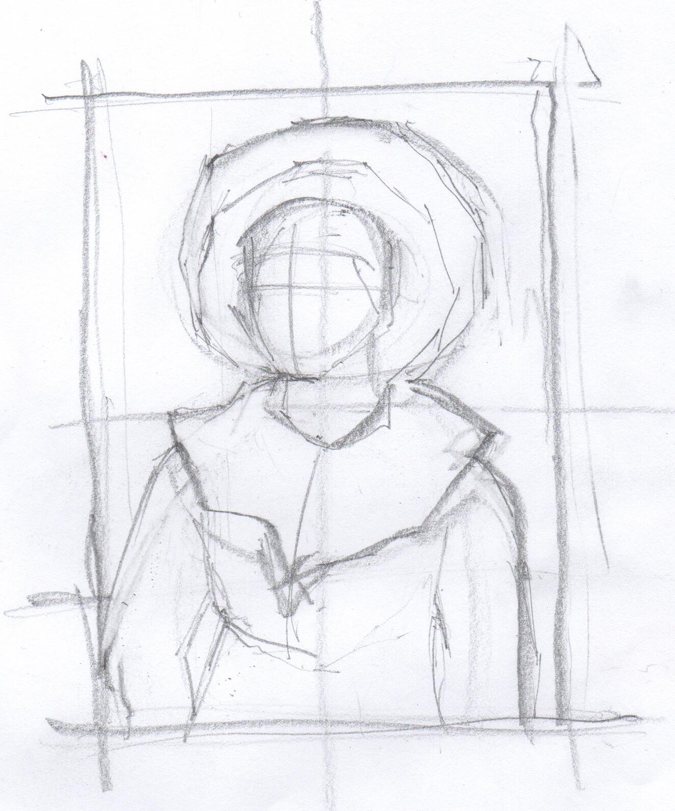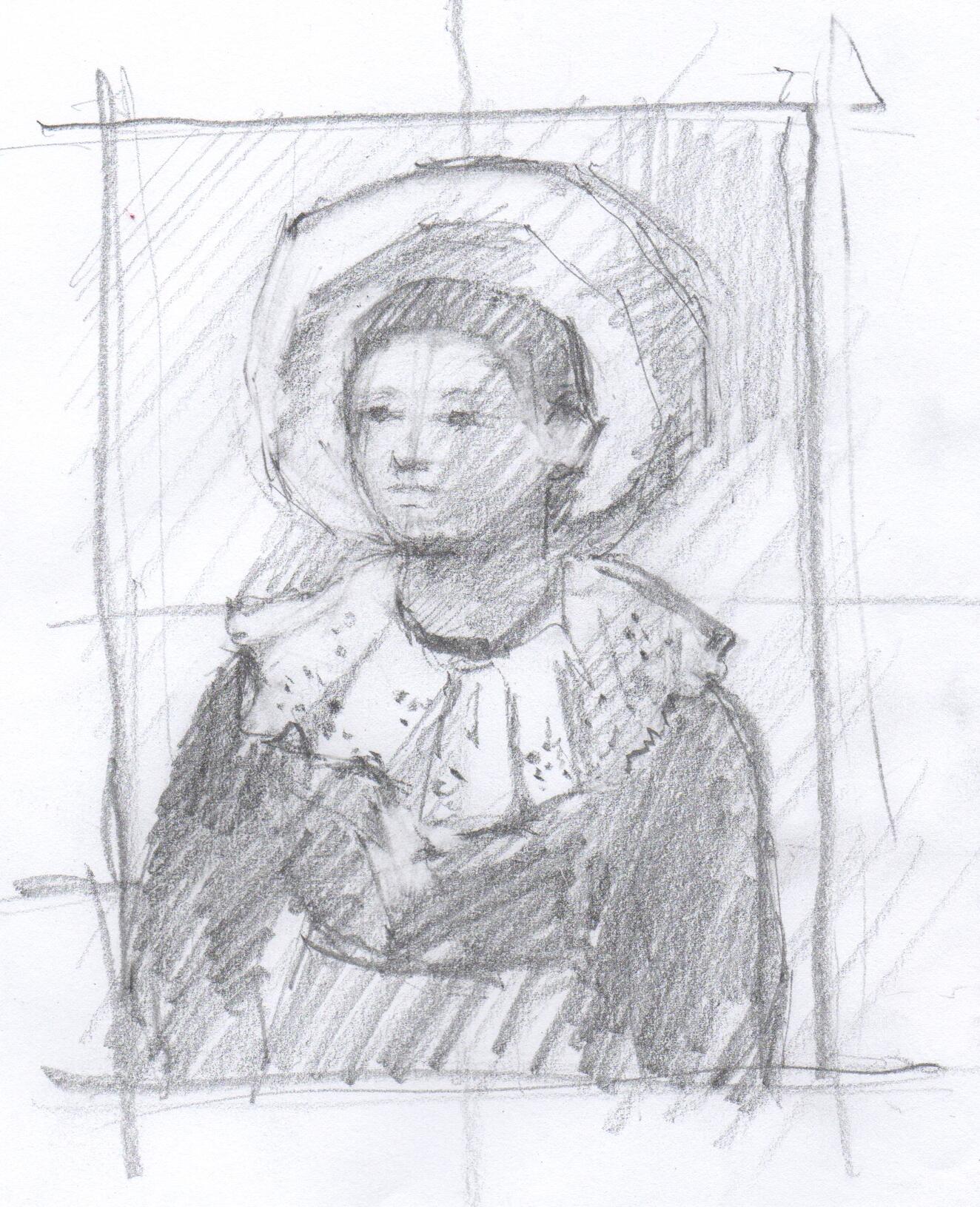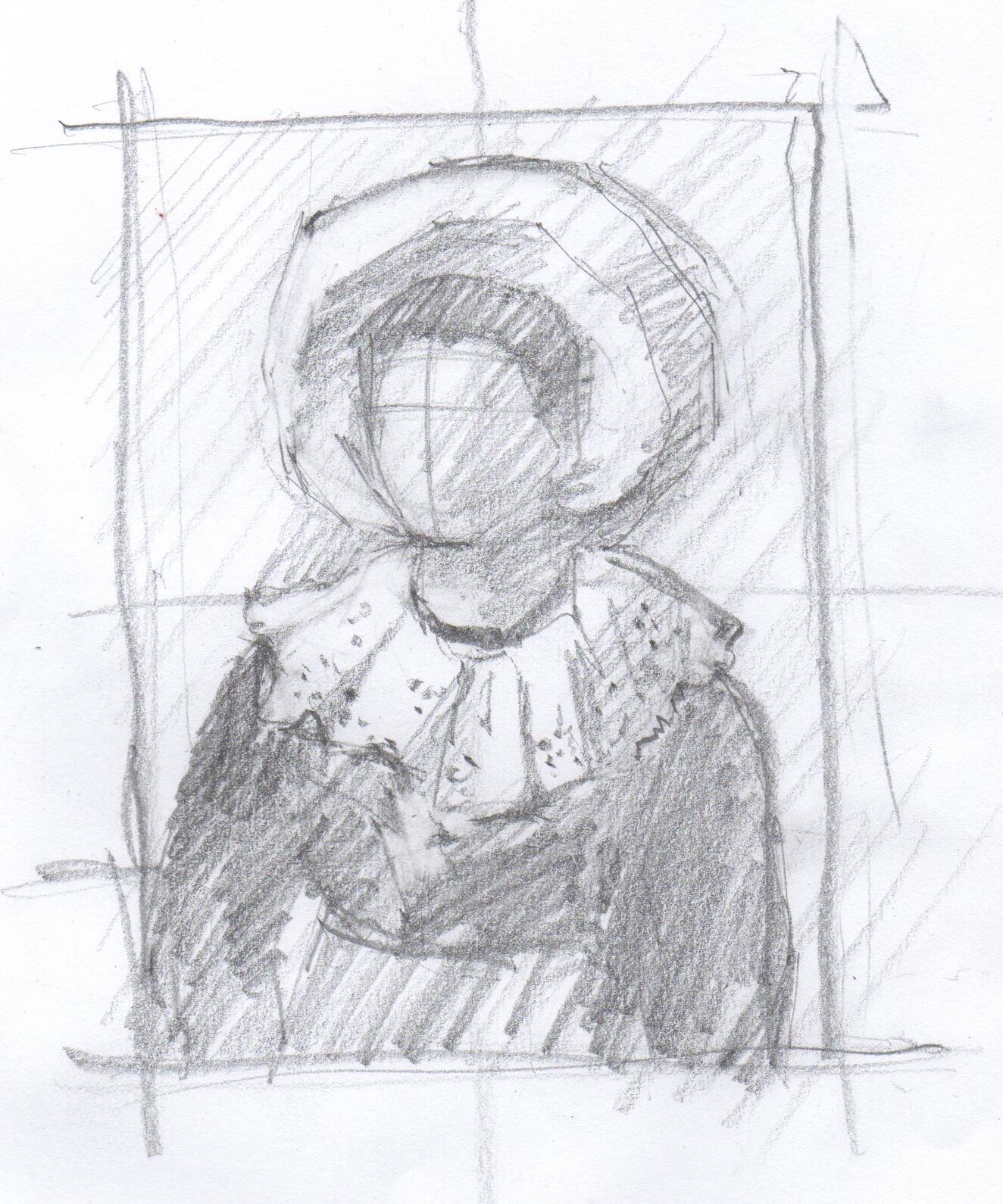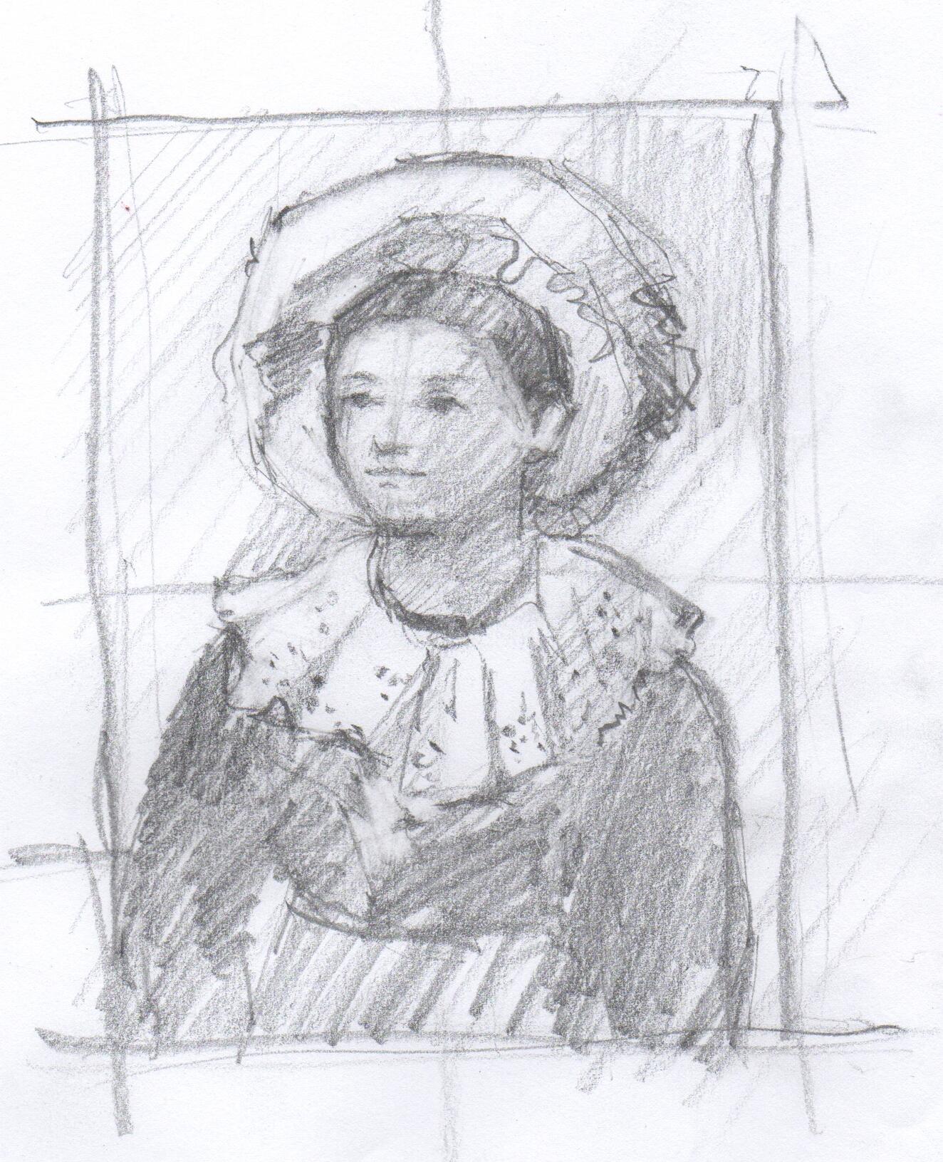 As I draw, I notice the chin is lower than I thought, and how big the bonnet is. Working from the top of the picture down, I take in the light and dark part of the bonnet and the shape of her hair, and note that her face is smaller than I originally thought.