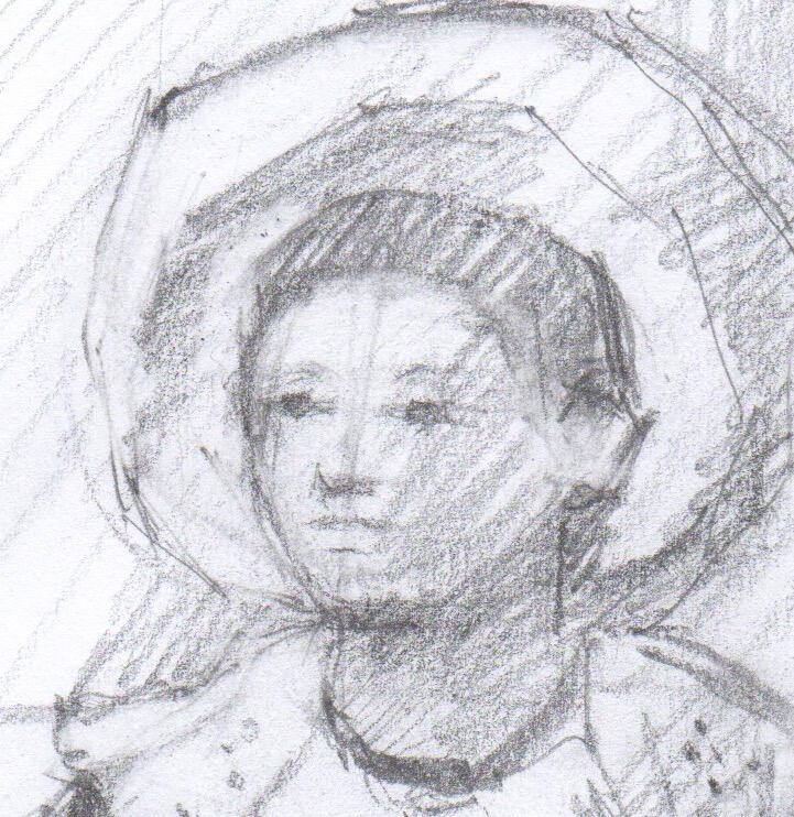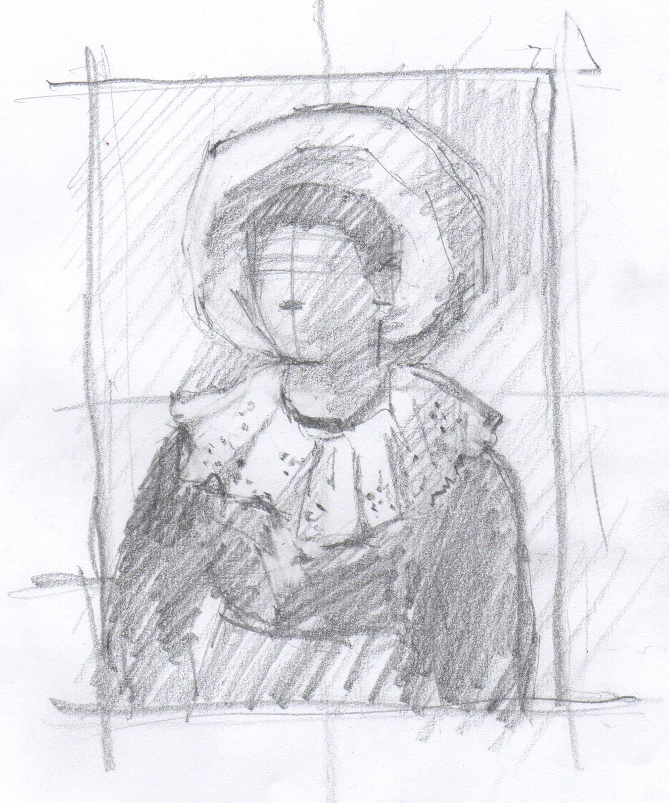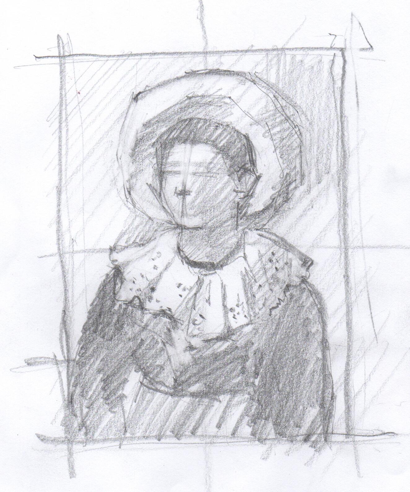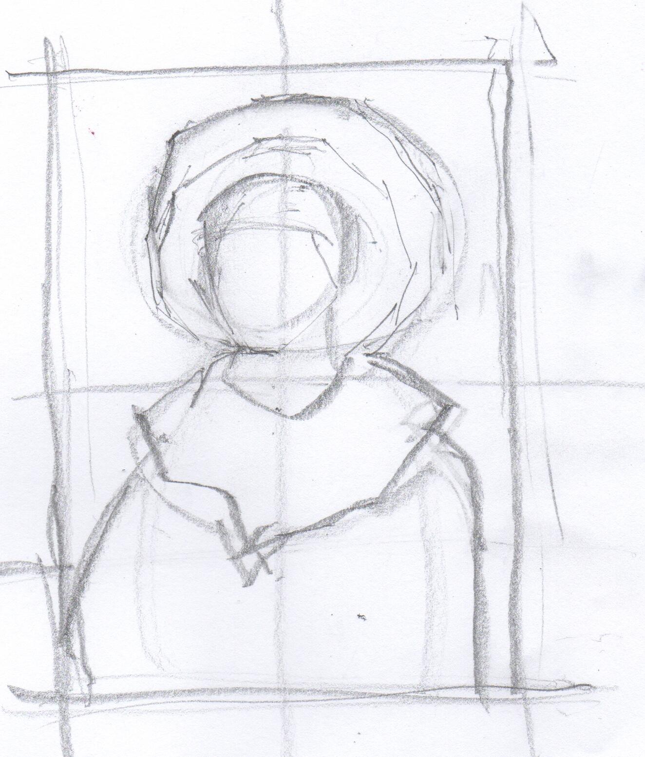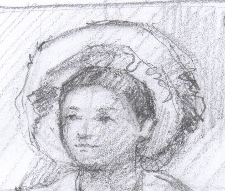 As I draw, I notice the chin is lower than I thought, and how big the bonnet is. Working from the top of the picture down, I take in the light and dark part of the bonnet and the shape of her hair, and note that her face is smaller than I originally thought.