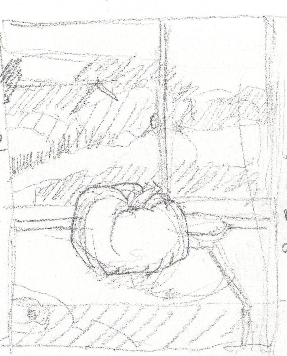 Thumbnail sketching: Matisse’s The Green Pumpkin is an interior still-life with a landscape seen through a window. Once again, the challenge is to simplify complex visual information. I do so by identifying the proportions, simple shapes, and basic values, then I add more detailed line work.