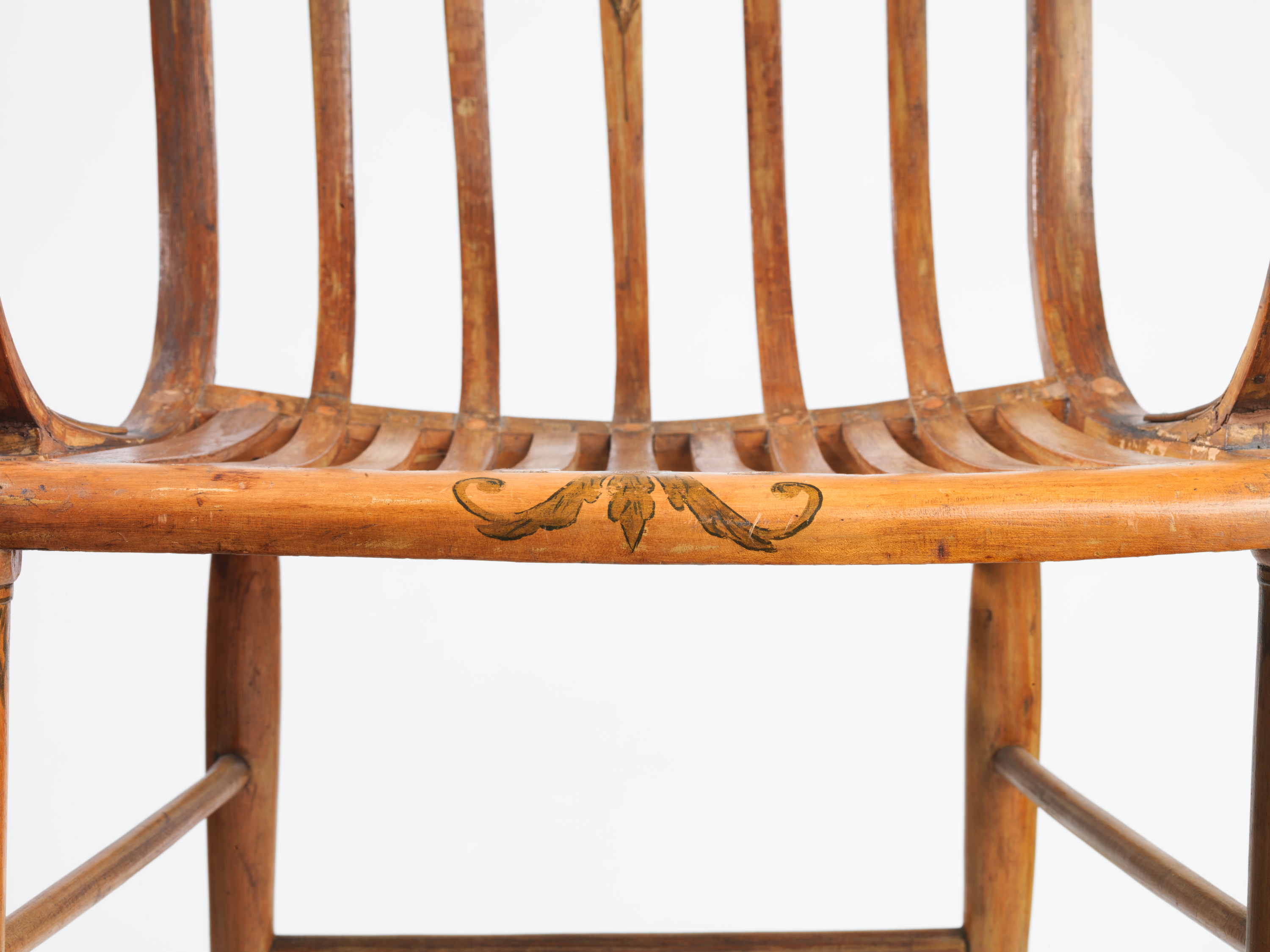 The Elastic armchair is normally located on the top floor of Pendleton House and featured in a parlor or living-room scene. Very different from this set up, in the exhibition the piece will be placed next to a classic Windsor armchair with a continuous bentwood back, since Samuel Gragg originally worked as a Windsor chair maker and drew inspiration from that iconic form. Patented in 1808, the Elastic chair is a clear indicator of fine craft and thought, integrating the recent technology in bentwood lamination with design and painted details referencing classical imagery, such as a Greek klismos chair and peacock feathers. The piece offers a great deal of information to the viewer in a very refined way, and was made using the steam-bending technique that well-known designers John Henry Belter and Michael Thonet popularized about 50 years later.