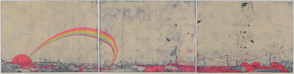 Allison Bianco, The Sinking of Matunuck, 2012. Mary B. Jackson Fund Maria Napolitano, Garden Close-Ups/Toy Soldiers 2, 2011. Museum purchase: gift of Joseph A. Chazan, MD Faith Ringgold, Under the Blood Red Sky, 2007. Gift of the Brandywine Workshop and Archives, Philadelphia, Pennsylvania Enrique Chagoya, The Pastoral or Arcadian State, Illegal Alien's Guide to Greater America, 2006. Gift of Faye Hirsch Mona Hatoum, Projection (Cotton), 2006. Richard Brown Baker Fund for Contemporary British Art Eliza Draper Gardiner, Untitled (Landscape with Mountains), 20th century. Woods-Gerry Gallery transfer Back Raid the Database 2 with Nafis White