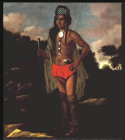 This painting is significant because it presents a colonial-era Eastern woodland coastal Indigenous leader largely as he was, without the biases and stereotypes seen in later portraits of American Indians. English and other European artists creating images from the “new world” did frequently take creative license, however. The background terrain does not represent the local landscape. Colonists wrongly equated sachems with European kings, so the artist presented Ninigret as royalty, with a draped cape and scepter, although it is highly unlikely he would have had either.