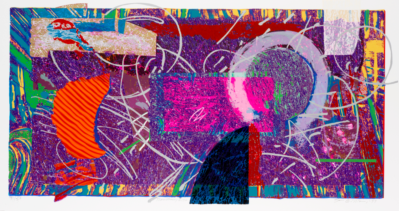 An abstract painting composed of swathes of vibrant greens, yellows and reds, which are overlaid by streaks of reds, blues, and black lines forming several circular shapes.