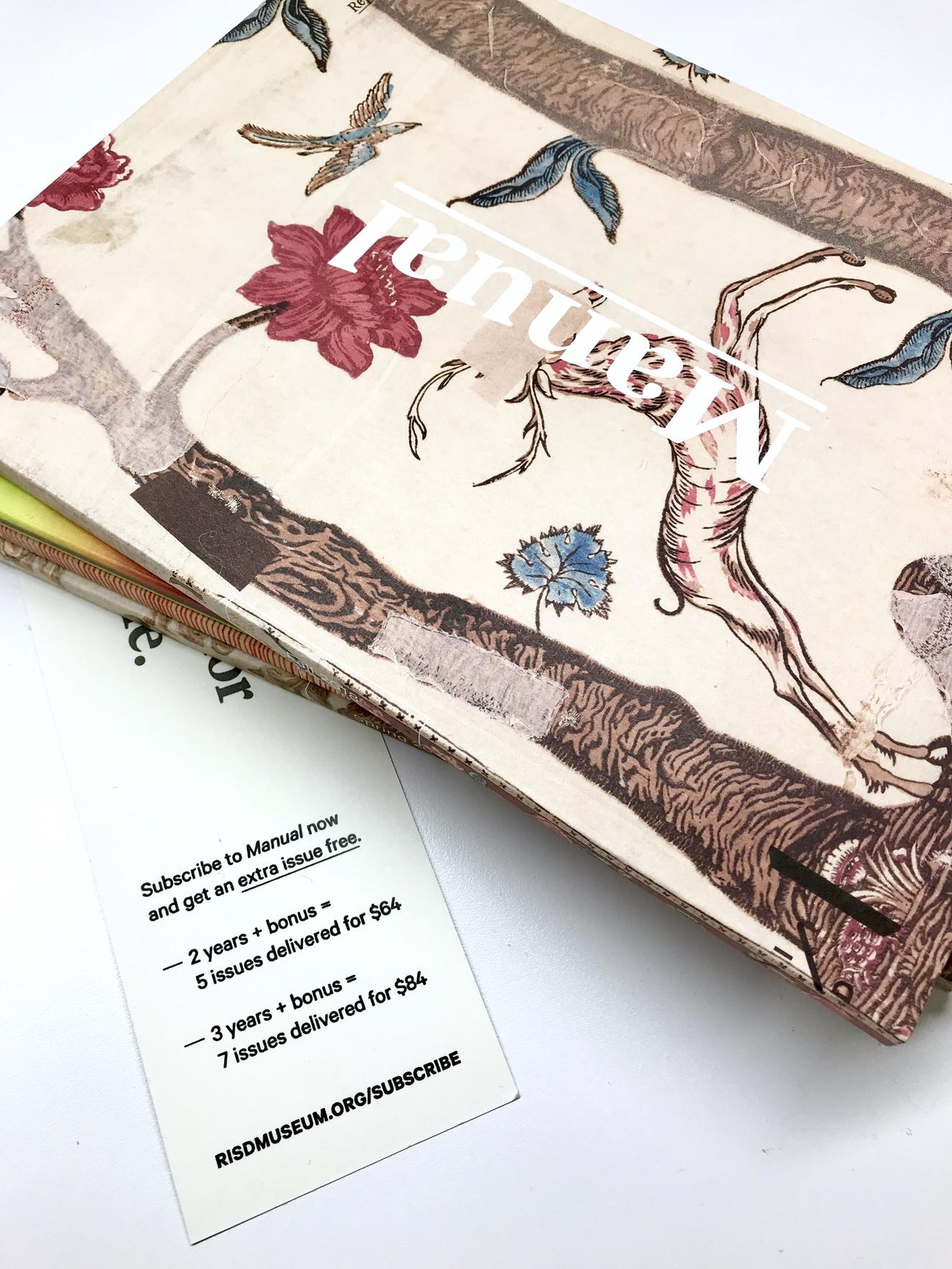 Manual: a journal about art and its making, a twice-yearly publication, uses the collections, exhibitions, and collaborations of the RISD Museum as an impetus for essays and interviews, artist interventions, and archive highlights. A fusion of academic arts journal and design magazine, Manual is a resource for engaged conversations about art, design, and the impact of creative making by curators, artists, scholars, and educators.