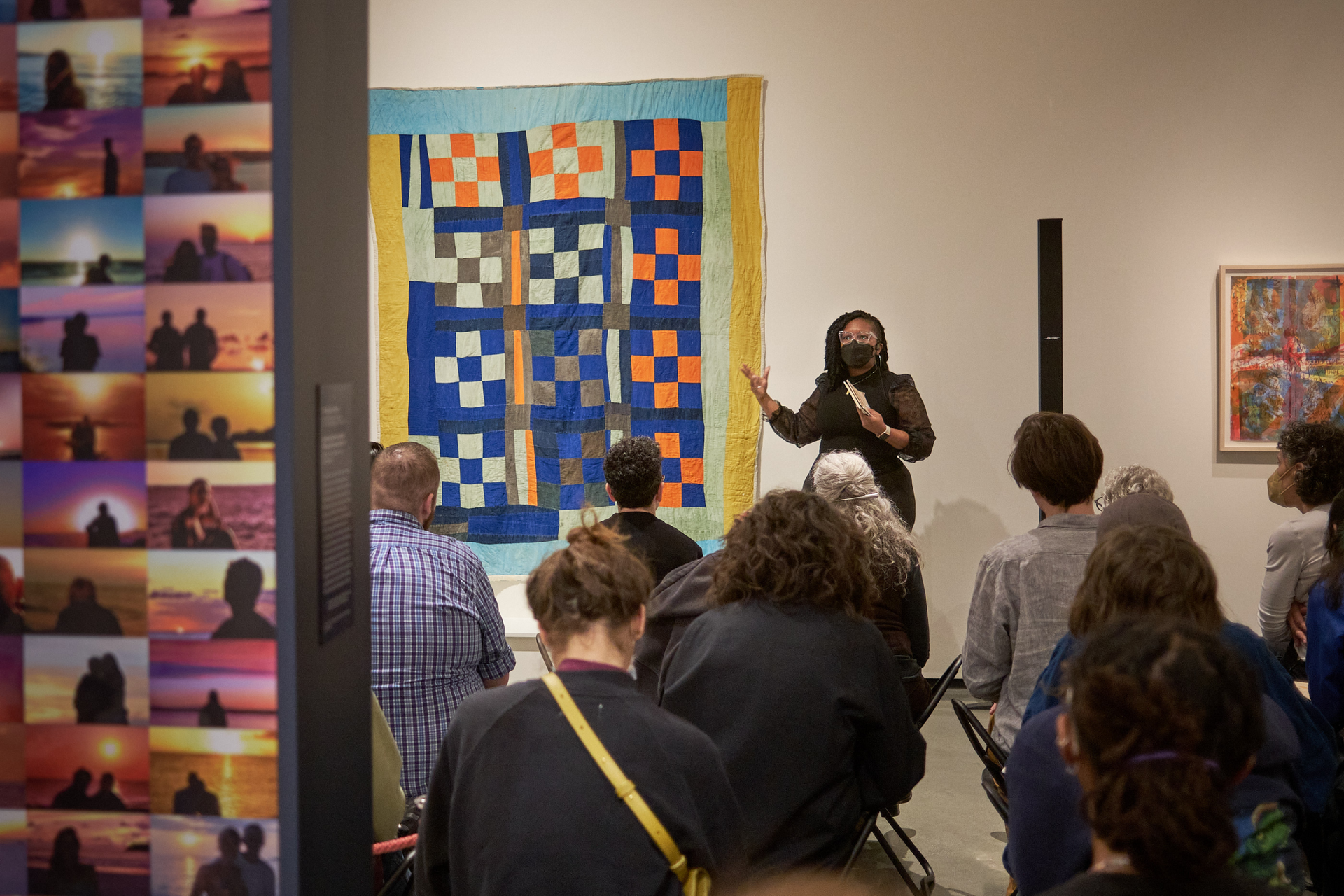 Adult programs offered this year included musical performances, readings, talks, and more. For example, the intersection of climate, environmental justice, and creative practices inspired the public program Art, Climate Crisis, and Activism, connected to the exhibit "Take Care.” Artists Meredith Stern, Dana Heng, and Erik Gould were in conversation with Dr. Sage Gerson, Assistant Professor, Literary Arts and Studies, RISD, and Dr. Hilda Lloréns, Associate Professor, Departments of Marine Affairs and Anthropology, University of Rhode Island, and joined by moderator April Brown, Director, Racial and Environmental Justice Committee. They discussed their work and the multidisciplinary connections with a standing-room only audience. We also launched Museum Professional Practices 101, a series of programs in which museum staff share their processes and recent projects as a way to demystify internal museum practices. In partnership with RISD’s Textiles department, we hosted Dr. Sharbreon Plummer for a gallery talk focused on Ruth Pettway Mosely's "Nine-Patch Quilt" (ca. 1955) and considered the Gee's Bend quiltmakers through a Black feminist lens, pulling out stories of autonomy, artistry, and intellectual, emotional, and physical labor. Dr. Plummer’s ongoing creative and academic endeavor to re-situate Black women’s voices and lived experiences in fiber art narratives highlighted stories of community, resistance, and self-determination in the past, as well as in contemporary textile-focused work.