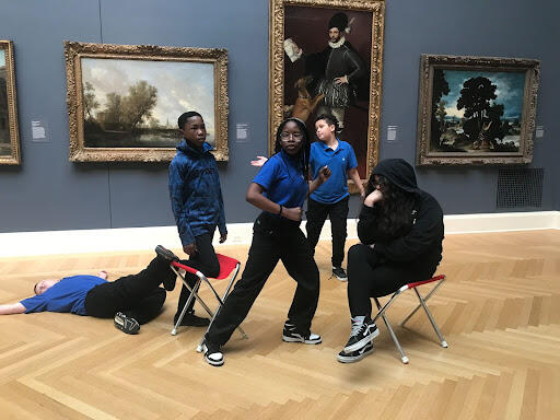 ▲5th and 6th grade students make connections to poses, compositions and storytelling by exploring Greek and Roman art and artifacts. Theater class from Achievement First Iluminar Middle School, Providence