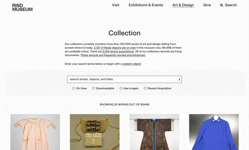 The RISD Museum website provides an opportunity to learn and engage with our collections, exhibitions, and dynamic digital materials like teaching resources, articles, videos, podcasts, and our digital publications. More than half of pageviews this fiscal year were collection searches or views of the more than 85,000 objects on the site.